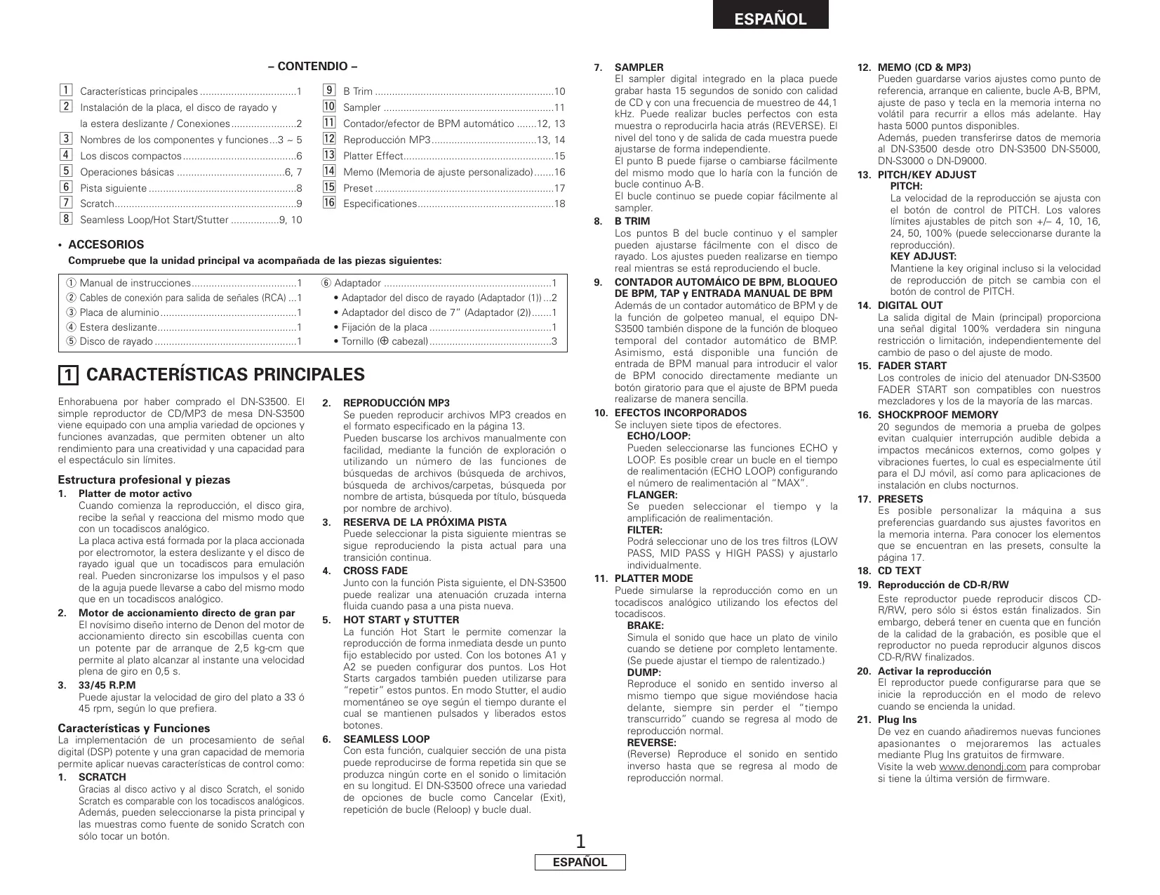 1 CARACTERÍSTICAS PRINCIPALES Enhorabuena por haber comprado el DN-S3500. El simple reproductor de CD/MP3 de mesa DN-S3500 viene equipado con una amplia variedad de opciones y funciones avanzadas, que permiten obtener un alto rendimiento para una creatividad y una capacidad para el espectáculo sin límites.