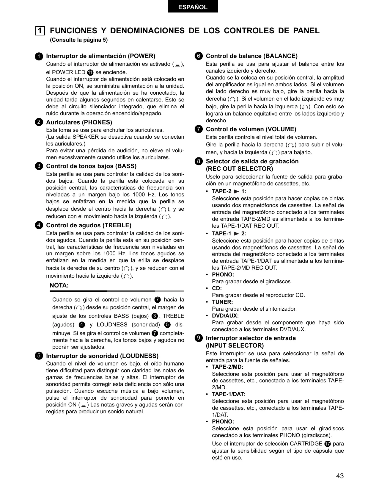 minuye. Si se gira el control de volumen @ completa- mente hacia la derecha, los tonos bajos y agudos no podrän ser ajustados.