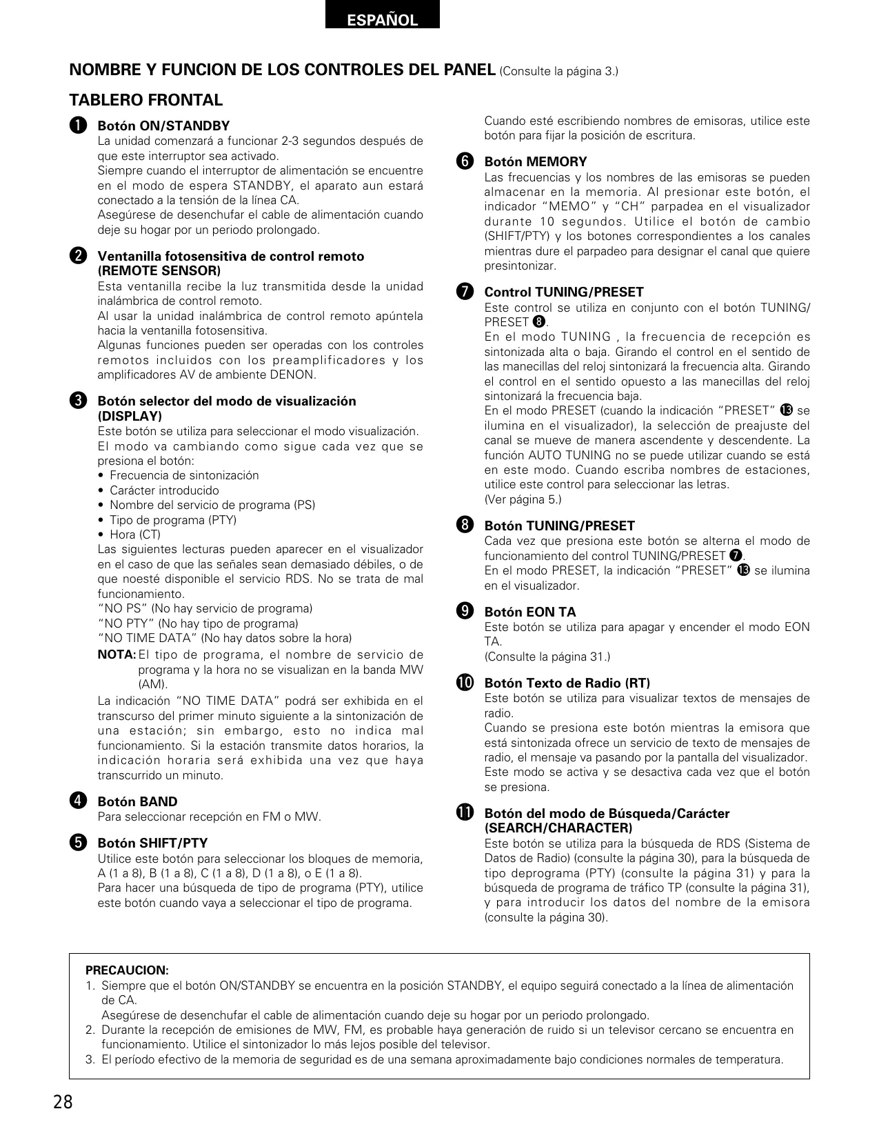 1. Siempre que el botón ON/STANDBY se encuentra en la posición STANDBY, el equipo seguirá conectado a la línea de alimentación de CA. Asegúrese de desenchufar el cable de alimentación cuando deje su hogar por un periodo prolongado. 2. Durante la recepción de emisiones de MW, FM, es probable haya generación de ruido si un televisor cercano se encuentra en funcionamiento. Utilice el sintonizador lo más lejos posible del televisor. 3. El período efectivo de la memoria de seguridad es de una semana aproximadamente bajo condiciones normales de temperatura.