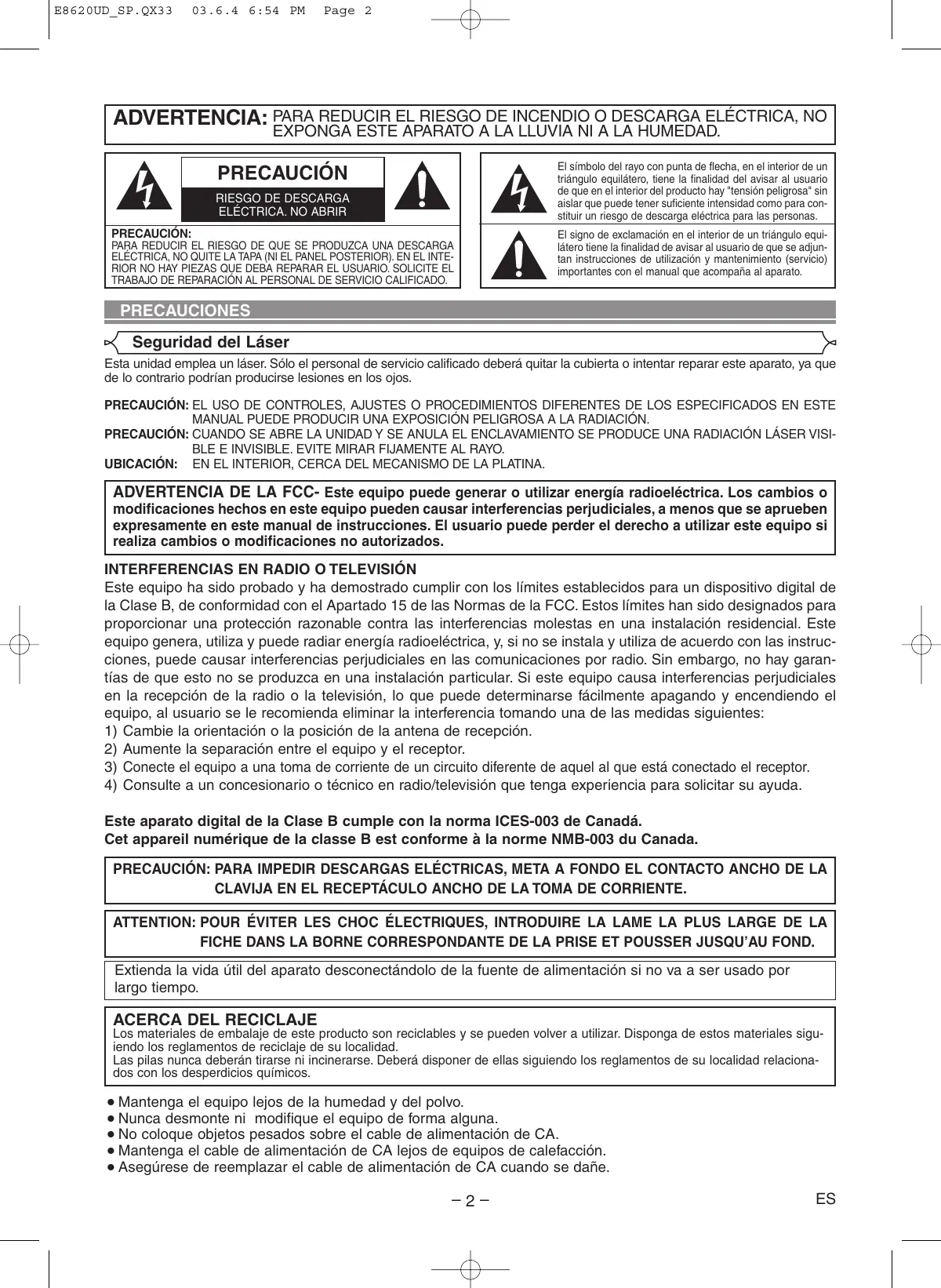 Esta unidad empsea un laser. Sólo el personal de service calificado deben qutar la cubierta o intentar reparar este aparato, ya que de lo contrario podrnan producirse lesiones en los ojos.