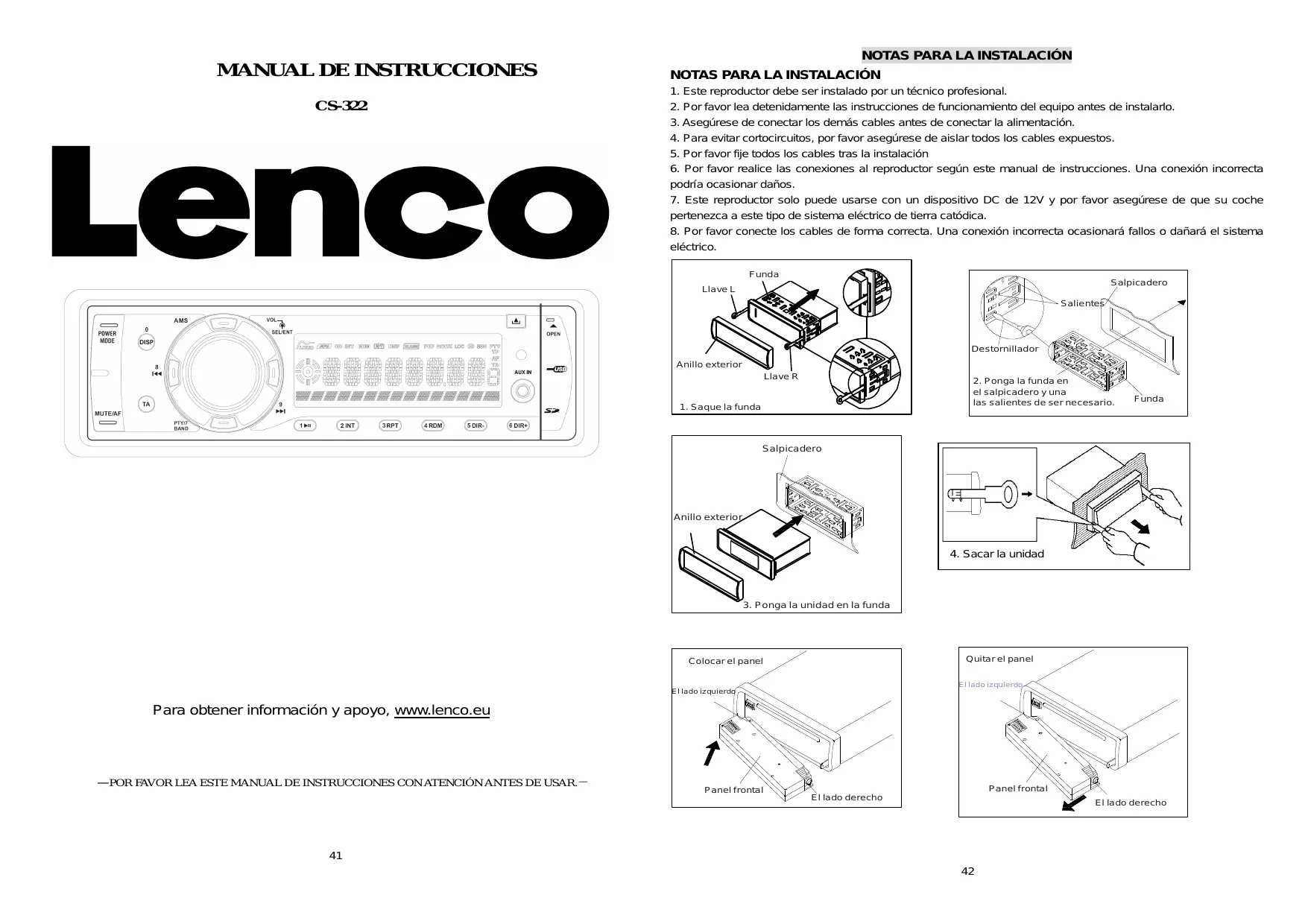 Quitar el panel Colocar el panel El lado izquierdo El lado izquierdo Para obtener información y apoyo, www.lenco.eu ―POR FAVOR LEA ESTE MANUAL DE INSTRUCCIONES CON ATENCIÓN ANTES DE USAR.- Panel frontal Panel frontal El lado derecho El lado derecho