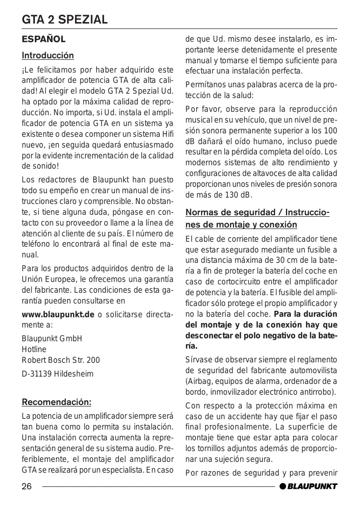 GTA 2 SPEZIAL ESPAÑOL Introducción ¡Le felicitamos por haber adquirido este amplificador de potencia GTA de alta calidad! Al elegir el modelo GTA 2 Spezial Ud. ha optado por la máxima calidad de reproducción. No importa, si Ud. instala el amplificador de potencia GTA en un sistema ya existente o desea componer un sistema Hifi nuevo, ¡en seguida quedará entusiasmado por la evidente incrementación de la calidad de sonido! Los redactores de Blaupunkt han puesto todo su empeño en crear un manual de instrucciones claro y comprensible. No obstante, si tiene alguna duda, póngase en contacto con su proveedor o llame a la línea de atención al cliente de su país. El número de teléfono lo encontrará al final de este manual. Para los productos adquiridos dentro de la Unión Europea, le ofrecemos una garantía del fabricante. Las condiciones de esta garantía pueden consultarse en www.blaupunkt.de o solicitarse directamente a: Blaupunkt GmbH Hotline Robert Bosch Str. 200 D-31139 Hildesheim