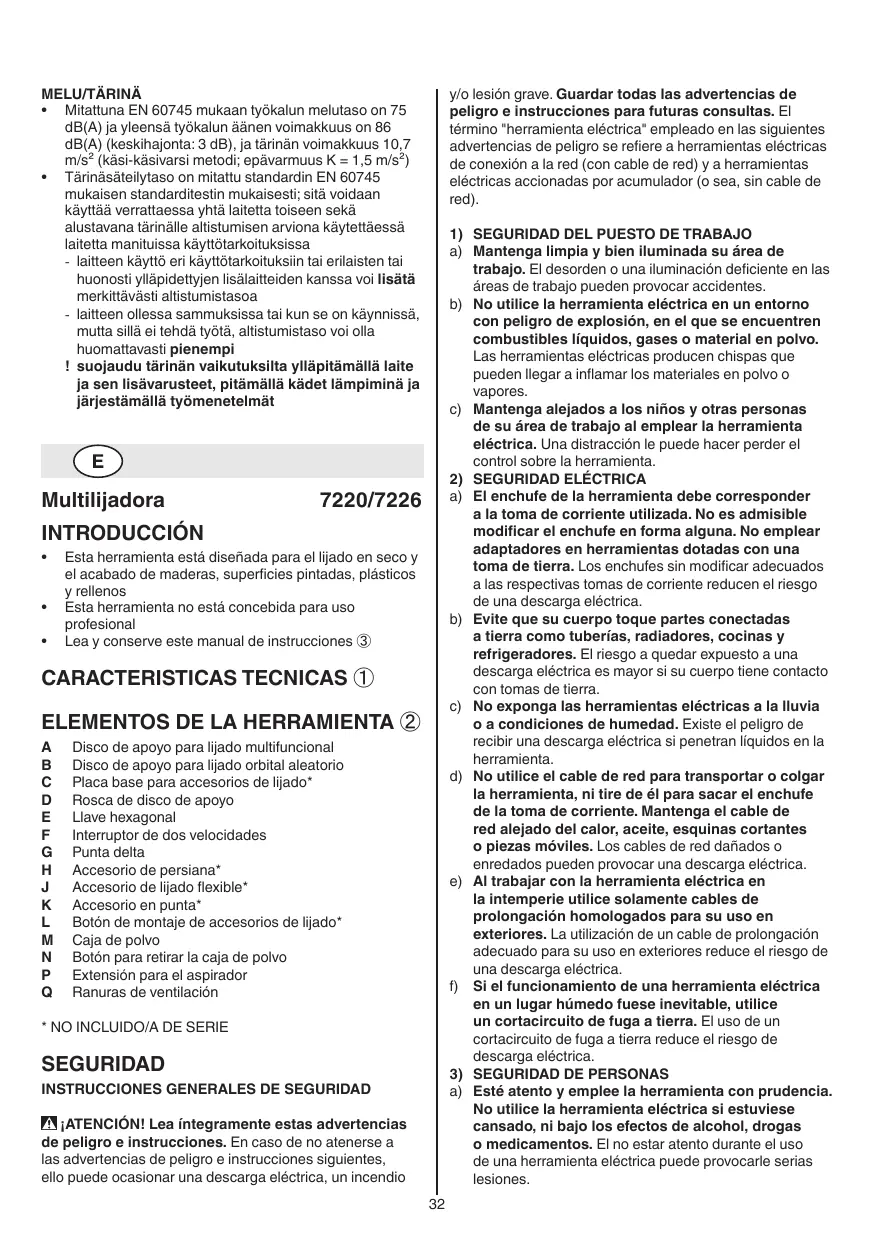 Mantenga siempre el cable lejos de las partes móviles de la herramienta; mantenga el cable detrás de usted, lejos de la herramienta Asegure la pieza de trabajo (una pieza de trabajo fijada con unos dispositivos de sujeción o en un tornillo de banco, se mantiene sujeta de forma mucho más segura que con la mano) Ponga atención al guardar su herramienta de que el motór está apagado y las partes móviles están parados Utilice cables de extensión seguros y completamente desenrollados con una capacidad de 16 amperios En el caso de que se produjera un mal funcionamiento eléctrico o mecánico, apague inmediatamente la herramienta y desconecte el enchufe SKIL únicamente puede garantizar un funcionamiento correcto de la herramienta al emplear accesorios originales Esta herramienta no debe utilizarse por personas menores de 16 años El nivel de ruido, con la herramienta trabajando, podrá sobrepasar 85 dB(A); usar protectores auditivos Si llega a dañarse o cortarse el cable eléctrico durante el trabajo, no tocar el cable, sino extraer inmediatamente el enchufe de la red No utilizar la herramienta cuando el cable esté dañado; hágalo cambiar por una persona calificada Compruebe siempre que la tensión de alimentación es la misma que la indicada en la placa de características de la herramienta (las herramientas de 230V o 240V pueden conectarse también a 220V) Esta herramienta no es adecuada para lijar con agua No trabaje materiales que contengan amianto (el amianto es cancerígeno) El polvo del material, como por ejemplo la pintura que contiene plomo, algunas especies de madera, minerales y metal podrían ser dañinos (el contacto o inhalación del polvo podría producir reacciones alérgicas y/o transtornos respiratorios al operador u otras personas cerca); utilice una máscara contra el polvo y trabaje con un dispositivo de extracción de polvo cuando lo conecte Ciertos tipos de polvo están catalogados como cancerígenos (por ejemplo el polvo de roble y de