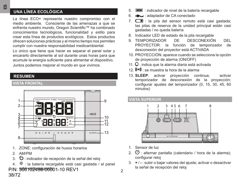 Una línea ecológica La línea ECO+ representa nuestro compromiso con el medio ambiente. Consciente de las amenazas a que se enfrenta nuestro mundo, Oregon Scientific™ ha combinado conocimientos tecnológicos, funcionalidad y estilo para crear esta línea de productos ecológicos. Estos productos ofrecen soluciones prácticas y al mismo tiempo nos permiten cumplir con nuestra responsabilidad medioambiental. Lo único que tiene que hacer es separar el panel solar y encararlo directamente al sol durante unas horas para que acumule la energía suficiente para alimentar el dispositivo. Juntos podemos mejorar el mundo en que vivimos.