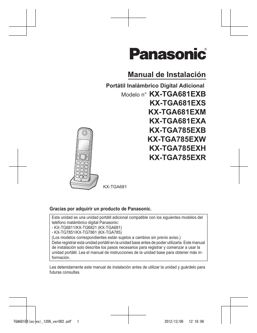 2012/12/06 12:15:06 Manual de Instalación Portátil Inalámbrico Digital Adicional Modelo n° Gracias por adquirir un producto de Panasonic. Esta unidad es una unidad portátil adicional compatible con los siguientes modelos del teléfono inalámbrico digital Panasonic: - KX-TG6811/KX-TG6821 (KX-TGA681) - KX-TG7851/KX-TG7861 (KX-TGA785) (Los modelos correspondientes están sujetos a cambios sin previo aviso.) Debe registrar esta unidad portátil en la unidad base antes de poder utilizarla. Este manual de instalación solo describe los pasos necesarios para registrar y comenzar a usar la unidad portátil. Lea el manual de instrucciones de la unidad base para obtener más información. Lea detenidamente este manual de instalación antes de utilizar la unidad y guárdelo para futuras consultas. TGA681EX(es-es)_1206_ver002.pdf