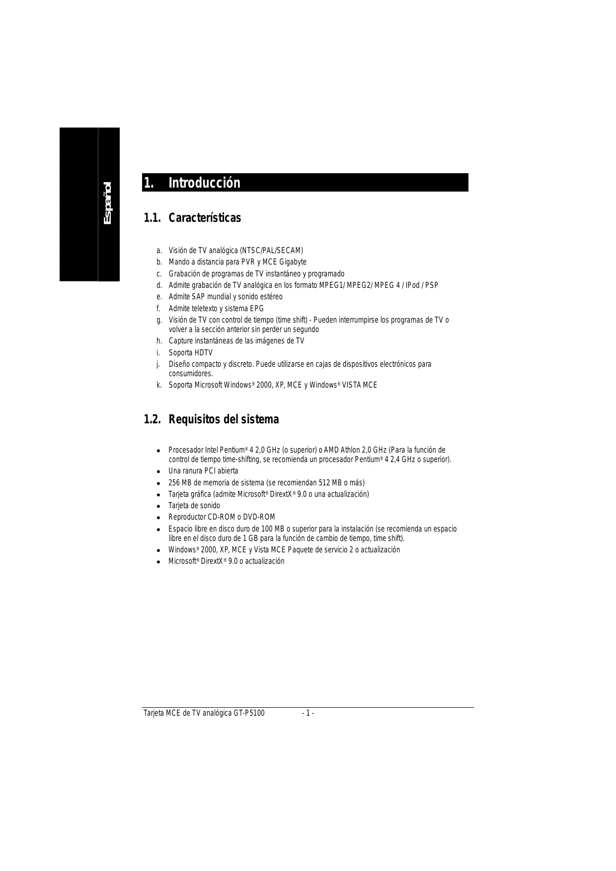 Procesador Intel Pentium® 4 2,0 GHz (o superior) o AMD Athlon 2,0 GHz (Para la función de control de tiempo time-shifting, se recomienda un procesador Pentium® 4 2,4 GHz o superior). Una ranura PCI abierta 256 MB de memoria de sistema (se recomiendan 512 MB o más) Tarjeta gráfica (admite Microsoft® DirextX® 9.0 o una actualización) Tarjeta de sonido Reproductor CD-ROM o DVD-ROM Espacio libre en disco duro de 100 MB o superior para la instalación (se recomienda un espacio libre en el disco duro de 1 GB para la función de cambio de tiempo, time shift). Windows® 2000, XP, MCE y Vista MCE Paquete de servicio 2 o actualización Microsoft® DirextX® 9.0 o actualización Tarjeta MCE de TV analógica GT-P5100