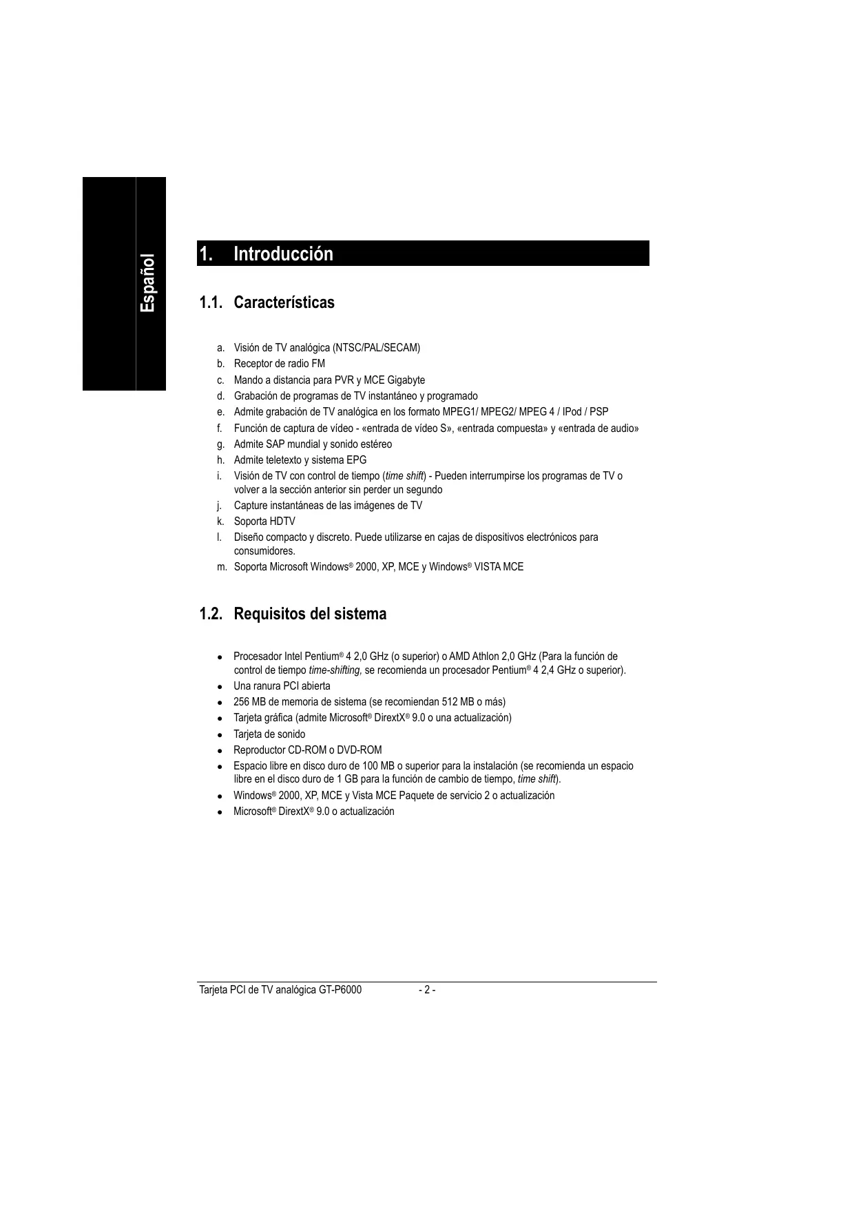 Visión de TV analógica (NTSC/PAL/SECAM) Receptor de radio FM Mando a distancia para PVR y MCE Gigabyte Grabación de programas de TV instantáneo y programado Admite grabación de TV analógica en los formato MPEG1/ MPEG2/ MPEG 4 / IPod / PSP Función de captura de vídeo - «entrada de vídeo S», «entrada compuesta» y «entrada de audio» Admite SAP mundial y sonido estéreo Admite teletexto y sistema EPG Visión de TV con control de tiempo (time shift) - Pueden interrumpirse los programas de TV o volver a la sección anterior sin perder un segundo j. Capture instantáneas de las imágenes de TV k. Soporta HDTV l. Diseño compacto y discreto. Puede utilizarse en cajas de dispositivos electrónicos para consumidores. m. Soporta Microsoft Windows® 2000, XP, MCE y Windows® VISTA MCE
