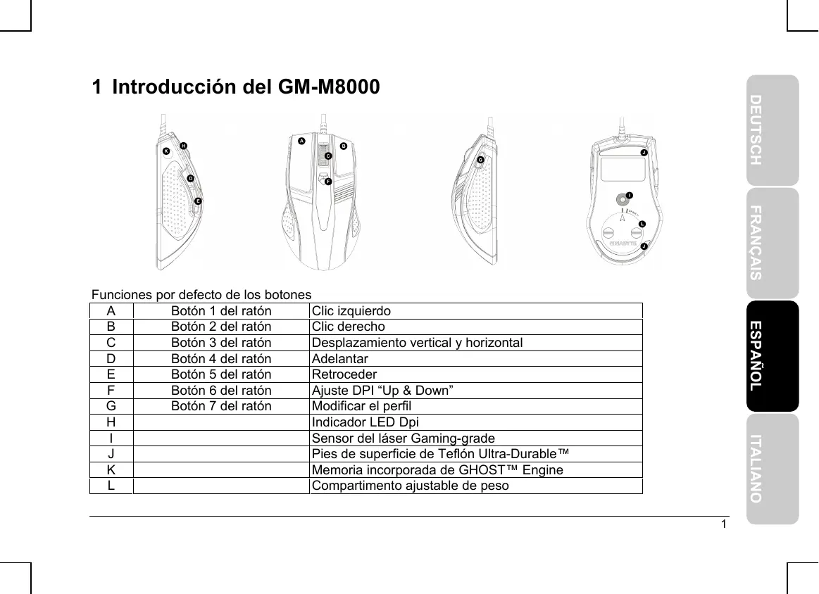A Botón 1 del ratón Clic izquierdo B Botón 2 del ratón Clic derecho C Botón 3 del ratón Desplazamiento vertical y horizontal D Botón 4 del ratón Adelantar E Botón 5 del ratón Retroceder F Botón 6 del ratón Ajuste DPI “Up & Down” G Botón 7 del ratón Modificar el perfil H Indicador LED Dpi I Sensor del láser Gaming-grade J Pies de superficie de Teflón Ultra-Durable™ K Memoria incorporada de GHOST™ Engine L Compartimento ajustable de peso