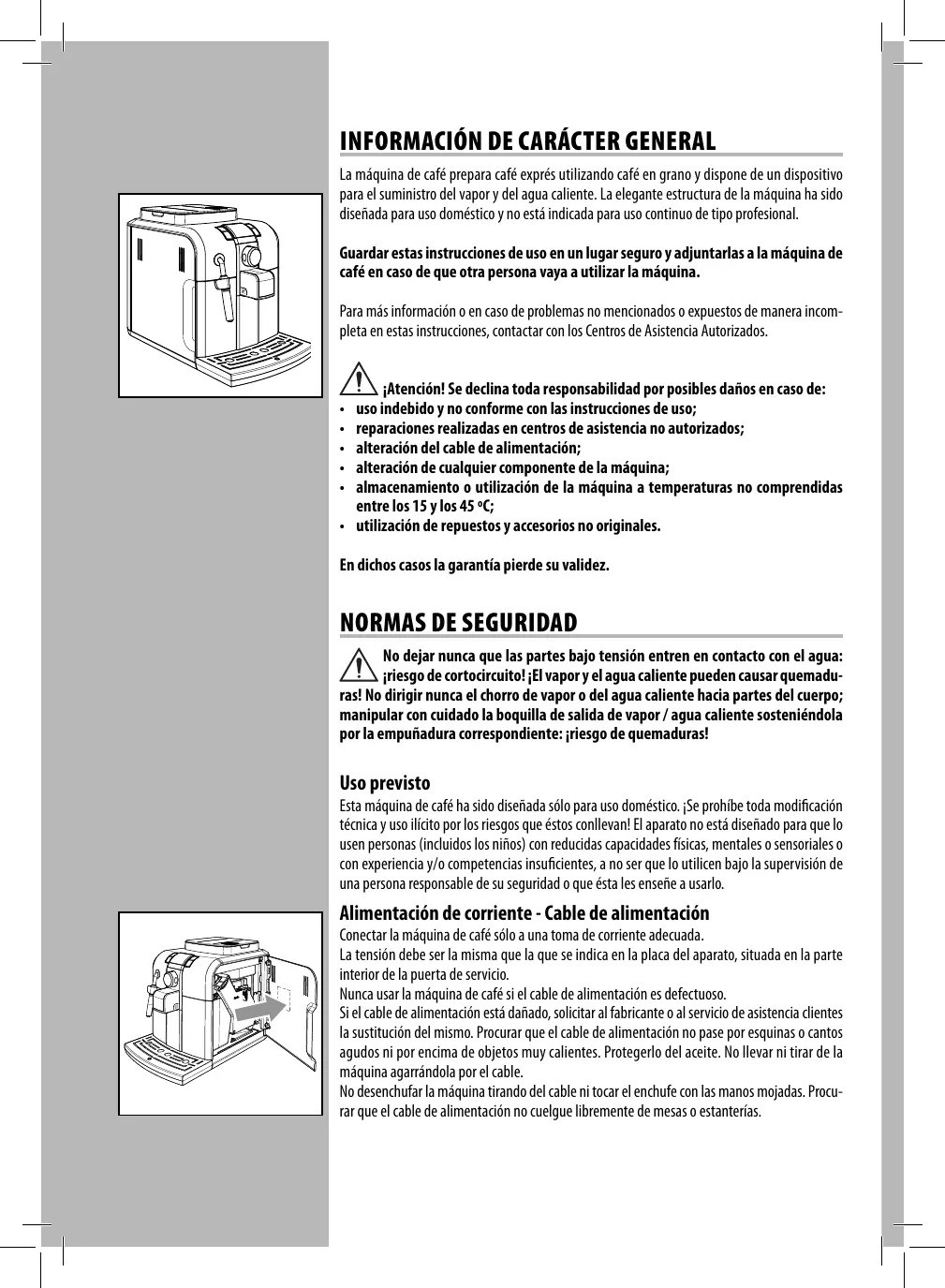 INFORMACIÓN DE CARÁCTER GENERAL La máquina de café prepara café exprés utilizando café en grano y dispone de un dispositivo para el suministro del vapor y del agua caliente. La elegante estructura de la máquina ha sido diseñada para uso doméstico y no está indicada para uso continuo de tipo profesional. Guardar estas instrucciones de uso en un lugar seguro y adjuntarlas a la máquina de café en caso de que otra persona vaya a utilizar la máquina. Para más información o en caso de problemas no mencionados o expuestos de manera incompleta en estas instrucciones, contactar con los Centros de Asistencia Autorizados. ¡Atención! Se declina toda responsabilidad por posibles daños en caso de: uso indebido y no conforme con las instrucciones de uso; reparaciones realizadas en centros de asistencia no autorizados; alteración del cable de alimentación; alteración de cualquier componente de la máquina; almacenamiento o utilización de la máquina a temperaturas no comprendidas entre los 15 y los 45 ºC; • utilización de repuestos y accesorios no originales. • • • • •