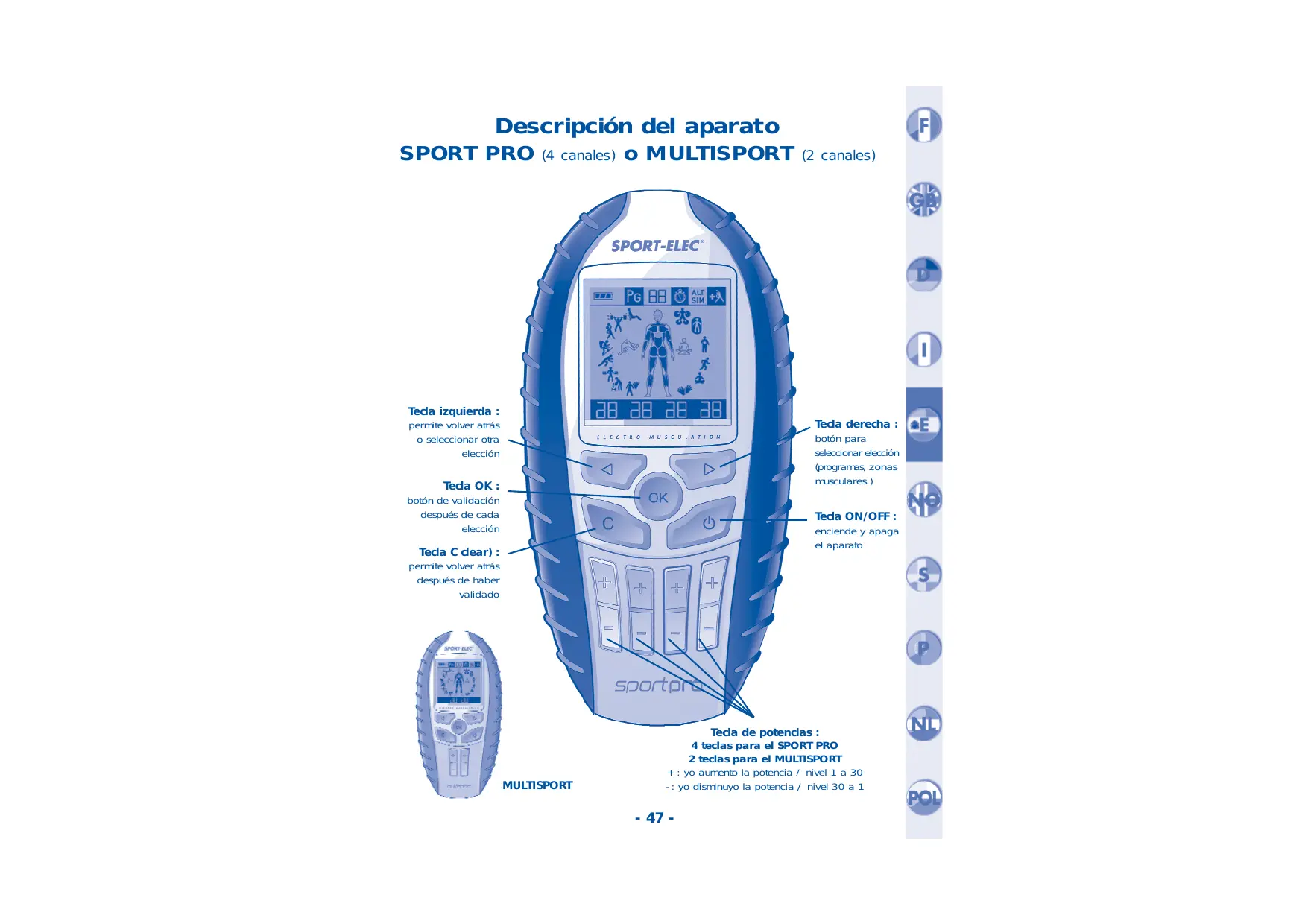 Descripción del aparato SPORT PRO (4 canales) o MULTISPORT Tecla izquierda : permite volver atrás o seleccionar otra elección (2 canales) Tecla derecha : botón para seleccionar elección (programas, zonas musculares.) Tecla OK : botón de validación después de cada elección Tecla ON/OFF : enciende y apaga el aparato Tecla C clear) : permite volver atrás después de haber validado MULTISPORT Tecla de potencias : 4 teclas para el SPORT PRO 2 teclas para el MULTISPORT + : yo aumento la potencia / nivel 1 a 30 - : yo disminuyo la potencia / nivel 30 a 1