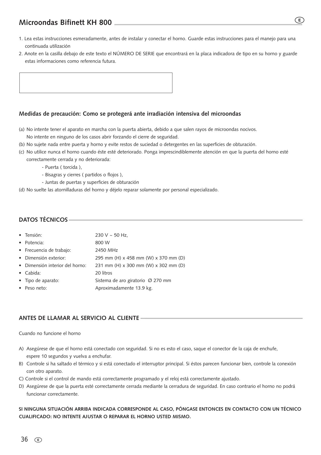 2. Anote en la casilla debajo de este texto el NÚMERO DE SERIE que encontrará en la placa indicadora de tipo en su horno y guarde estas informaciones como referencia futura.