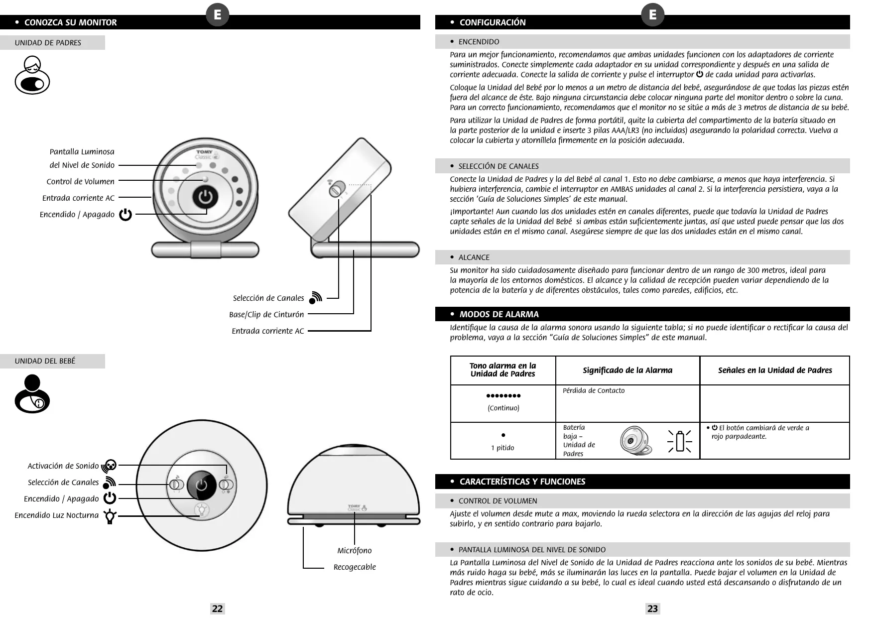 El Monitor para Bebés de Tomy está diseñado para ayudarle a vigilar a su niño y no sustituye la supervisión de un adulto. Este producto no es un juguete. Su monitor transmite en ondas públicas. Su conversación puede ser escuchada por otro producto que funcione en la misma frecuencia. Mantenga siempre los artículos eléctricos y sus cables fuera del alcance de los bebés y niños pequeños. Bajo ninguna circunstancia debe colocar ninguna pieza de su monitor en o sobre la cuna. Asegúrese de que todos los cables estén colocados correctamente, de forma que los niños no se enreden en ellos y no haya peligro de tropiezos. Los adaptadores que vienen con el monitor no deben ser usados con ningún otro equipo bajo ninguna circunstancia. No debe utilizarse ningún otro adaptador con el monitor. Tenga cuidado de no colocar el adaptador en un lugar donde el niño pueda subirse a él. Poner peso sobre el adaptador mientras está conectado puede dañar la unidad o causar lesiones a su niño. Es normal que los cargadores se calienten al usarse - tenga cuidado al manipular su cargador, espere a que se enfríe. NO LO CUBRA. Desconecte el cargador si el producto no va a usarse durante algunos días. Para evitar riesgo de descarga eléctrica, desconéctelo de la electricidad antes de limpiarlo. No tirar junto con los residuos domésticos. No intente desmontar ninguna pieza de este producto.