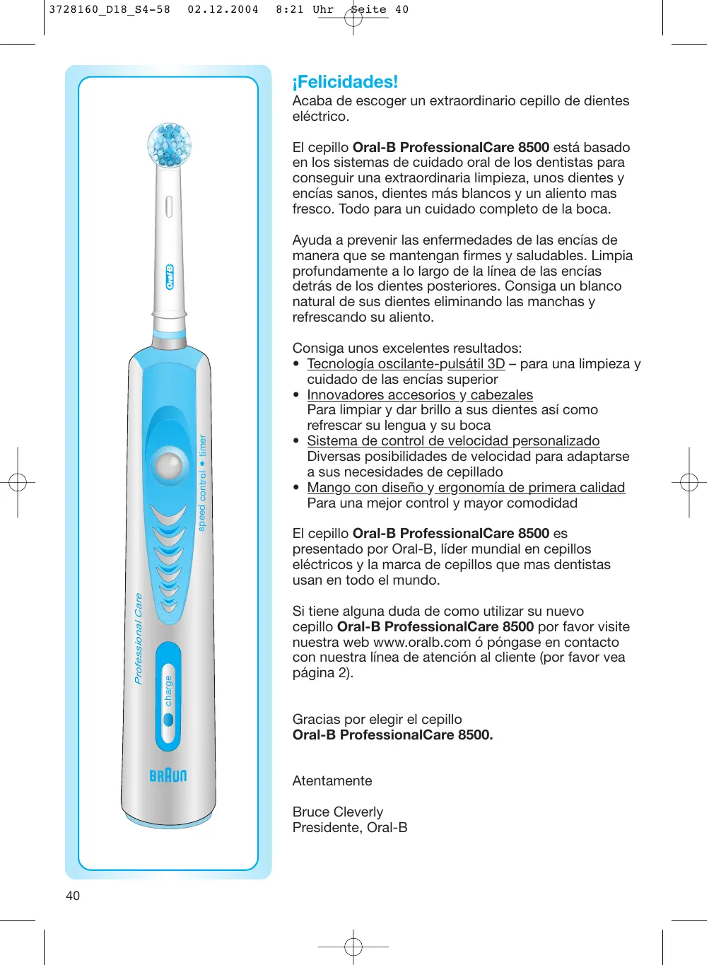 - Mango con diseño y ergonomía de primera calidad Para una mejor control y mayor comodidad El cepillo Oral-B ProfessionalCare 8500 es presentado por Oral-B, líder mundial en cepillos eléctricos y la marca de cepillos que mas dentistas usan en todo el mundo. Si tiene alguna duda de como utilizar su nuevo cepillo Oral-B ProfessionalCare 8500 por favor visite nuestra web www.oralb.com ó póngase en contacto con nuestra línea de atención al cliente (por favor vea página 2). Gracias por elegir el cepillo Oral-B ProfessionalCare 8500. Atentamente Bruce Cleverly Presidente, Oral-B