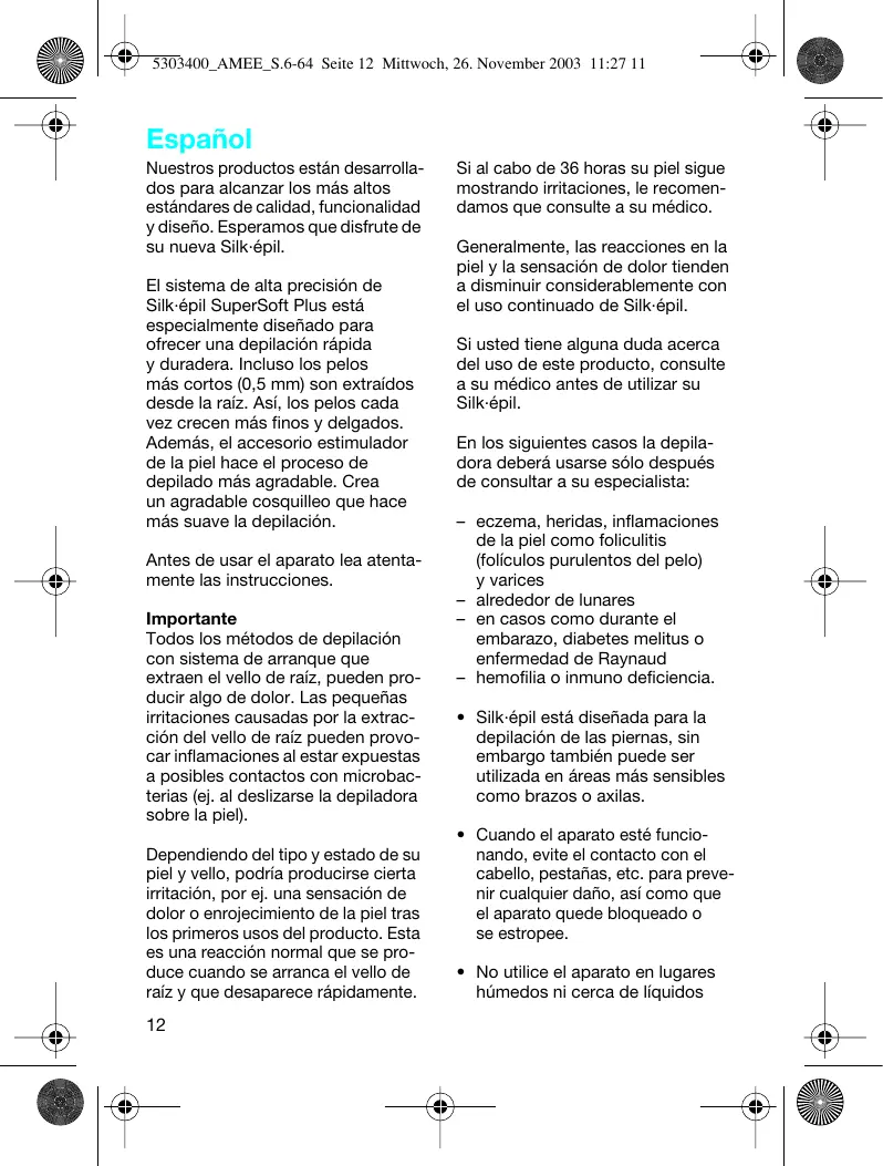 5303400_AMEE_S.6-64 Seite 12 Mittwoch, 26. November 2003 11:27 11 Español Nuestros productos están desarrollados para alcanzar los más altos estándares de calidad, funcionalidad y diseño. Esperamos que disfrute de su nueva Silk·épil. El sistema de alta precisión de Silk·épil SuperSoft Plus está especialmente diseñado para ofrecer una depilación rápida y duradera. Incluso los pelos más cortos (0,5 mm) son extraídos desde la raíz. Así, los pelos cada vez crecen más finos y delgados. Además, el accesorio estimulador de la piel hace el proceso de depilado más agradable. Crea un agradable cosquilleo que hace más suave la depilación. Antes de usar el aparato lea atentamente las instrucciones. Importante Todos los métodos de depilación con sistema de arranque que extraen el vello de raíz, pueden producir algo de dolor. Las pequeñas irritaciones causadas por la extracción del vello de raíz pueden provocar inflamaciones al estar expuestas a posibles contactos con microbacterias (ej. al deslizarse la depiladora sobre la piel). Dependiendo del tipo y estado de su piel y vello, podría producirse cierta irritación, por ej. una sensación de dolor o enrojecimiento de la piel tras los primeros usos del producto. Esta es una reacción normal que se produce cuando se arranca el vello de raíz y que desaparece rápidamente.