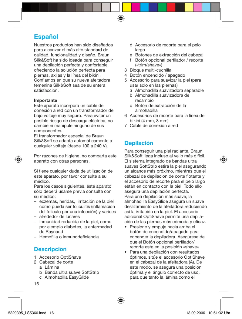 Español Nuestros productos han sido diseñados para alcanzar el más alto standard de calidad, funcionalidad y diseño. Braun Silk&Soft ha sido ideada para conseguir una depilación perfecta y confortable, ofreciendo la solución perfecta para piernas, axilas y la línea del bikini. Confiamos en que su nueva afeitadora femenina Silk&Soft sea de su entera satisfacción. Importante Este aparato incorpora un cable de conexión a red con un transformador de bajo voltaje muy seguro. Para evitar un posible riesgo de descarga eléctrica, no cambie ni manipule ninguno de sus componentes. El transformador especial de Braun Silk&Soft se adapta automáticamente a cualquier voltaje (desde 100 a 240 V). Por razones de higiene, no comparta este aparato con otras personas. Si tiene cualquier duda de utilización de este aparato, por favor consulte a su médico. Para los casos siguientes, este aparato sólo deberá usarse previa consulta con su médico: – eczemas, heridas, irritación de la piel como pueda ser foliculitis (inflamación del folículo por una infección) y varices – alrededor de lunares – Inmunidad reducida de la piel, como por ejemplo diabetes, la enfermedad de Raynaud – Hemofilia o inmunodeficiencia Descripcion 1 Accesorio OptiShave 2 Cabezal de corte a Lámina b Banda ultra suave SoftStrip c Almohadilla EasyGlide