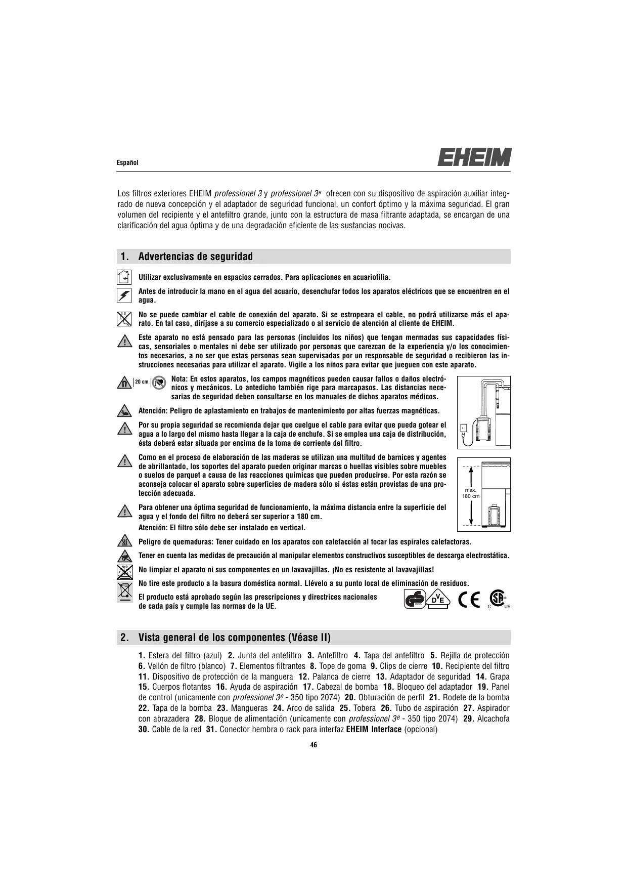 Los filtros exteriorores EHEIM professionnel 3 y professionnel 3^e -ofrecen con su dispositivo de aspiracion auxiliar integrado de neue concepcion y el adaptorder de seguridad funcional, un comfort optimo y la maxima seguridad. El gran volumen del recipiente y el antiflto grande, juno con la estrutura de masa filtrante adaptada, se encargan de una clarificacion del agua optima y de una degradacion eficiente de las sustancias nocivas.