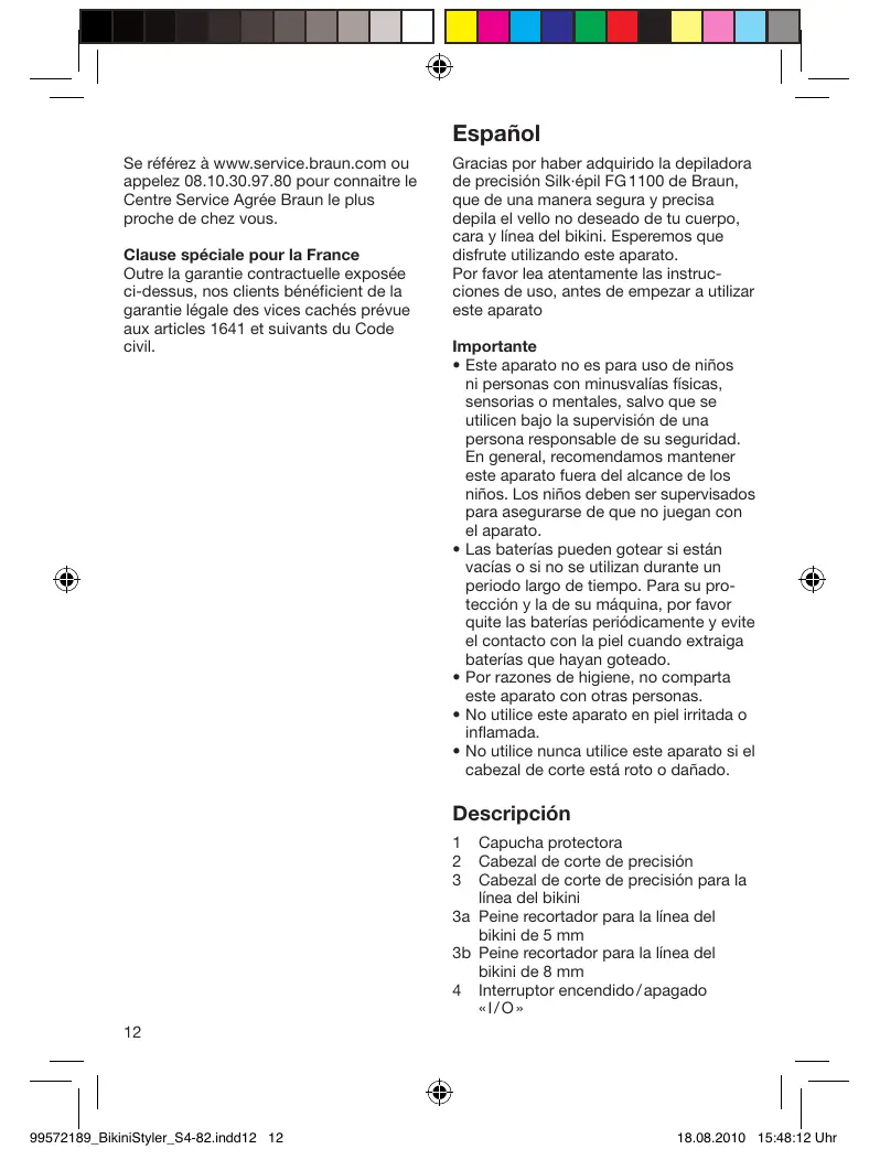 Español Gracias por haber adquirido la depiladora de precisién Silk-épil FG 1100 de Braun, que de una manera segura y precisa depila el velo no deseado de tu cuerpo, cara y linea del bikini. Esperemos que disfrute utilizando este aparato. Por favor lea atentamente las instruc- ciones de uso, antes de empezar a utilizar este aparato Importante + Este aparato no es para uso de niños ni personas con minusvalias fisicas, sensorias o mentales, salvo que se tilicen bajo la supervisién de una persona responsable de su seguridad. En general, recomendamos mantener este aparato fuera del alcance de los niños. Los niños deben ser supervisados para asegurarse de que no juegan con el aparato. + Las baterias pueden gotear si estän vacias o si no se utilizan durante un periodo largo de tiempo. Para su pro- teccién y la de su mäquina, por favor quite las baterias periôdicamente y evite el contacto con la piel cuando extraiga baterias que hayan goteado. + Por razones de higiene, no comparta este aparato con otras personas. + No utiice este aparato en piel irritada o inflamada. + No utiice nunca utilice este aparato si el cabezal de corte estä roto o dañado. Descripcién 1 Capucha protectora 2 Cabezal de corte de precisiôn 3 Cabezal de corte de precisiôn para la linea del bikini 8a Peine recortador para la linea del bikini de 5 mm 8b Peine recortador para la linea del bikini de 8 mm 4 Interruptor encendido /apagado «1/0»