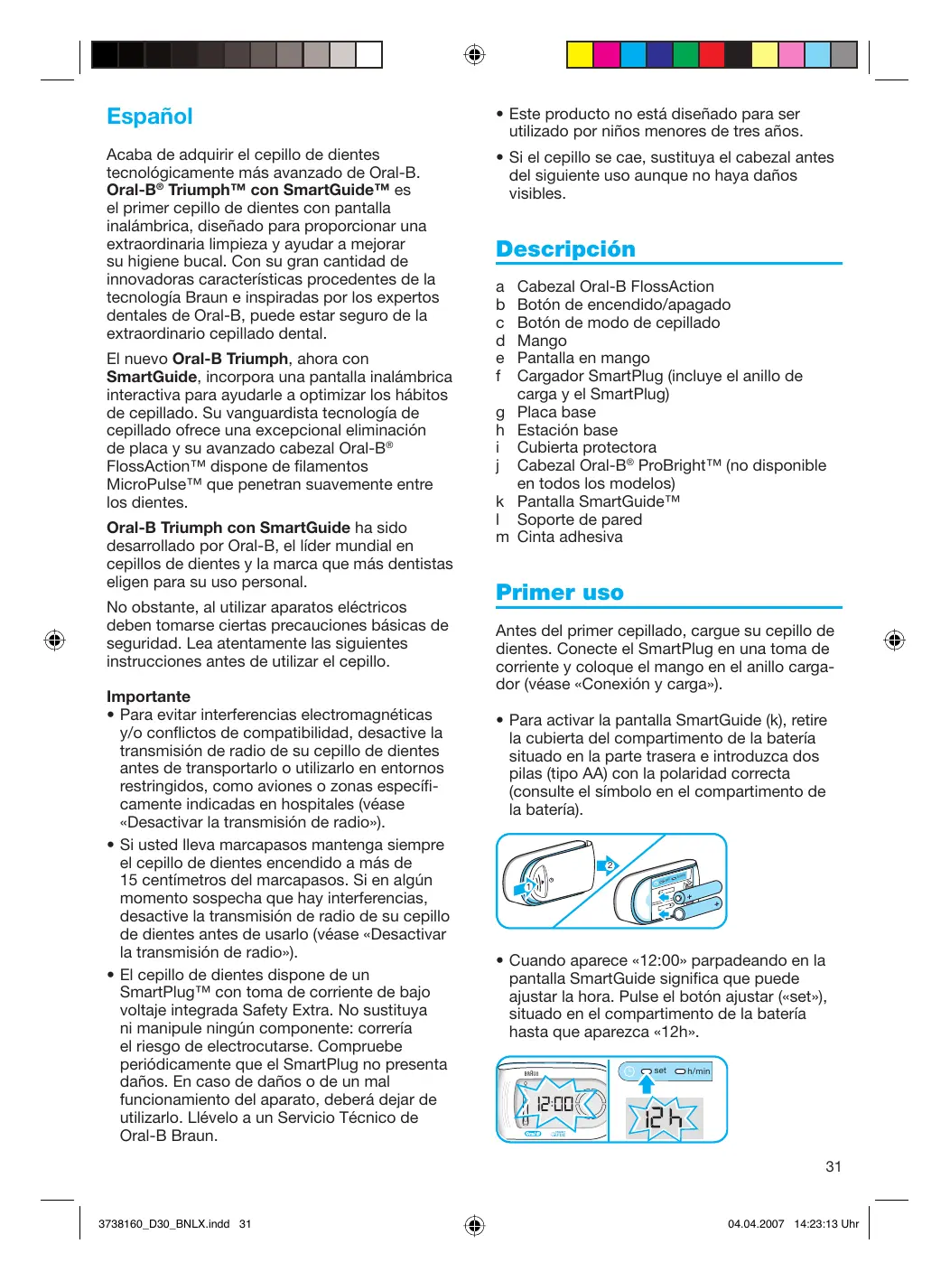 Español Acaba de adquirir el cepillo de dientes tecnolégicamente més avanzado de Oral-B. Oral-B° Triumph'" con SmartGuide’" es el primer cepillo de dientes con pantalla inalämbrica, diseñado para proporcionar una extraordinaria limpieza y ayudar a mejorar su higiene bucal, Con su gran cantidad de innovadoras caracteristicas procedentes de la tecnologia Braun e inspiradas por los expertos dentales de Oral-B, puede estar seguro de la extraordinario cepillado dental. El nuevo Oral-B Triumph, ahora con SmartGuide, incorpora una pantalla inalémbrica interactiva para ayudarle a optimizar los hébitos de cepillado. Su vanguardista tecnologia de cepillado ofrece una excepcional eliminaciôn de placa y su avanzado cabezal Oral-B° FlossAction'" dispone de filamentos MicroPulse"” que penetran suavemente entre los dientes. Oral-B Triumph con SmartGuide ha sido desarrollado por Oral-B, el lider mundial en cepillos de dientes y la marca que més dentistas eligen para su uso personal. No obstante, al utilizar aparatos eléctricos deben tomarse ciertas precauciones bésicas de seguridad. Lea atentamente las siguientes instrucciones antes de utilizar el cepillo. Importante + Para evitar interferencias electromagnéticas y/o contlictos de compatibilidad, desactive la transmisiôn de radio de su cepillo de dientes antes de transportarlo o utilizarlo en entornos restringidos, como aviones o zonas especifi- camente indicadas en hospitales (véase «Desactivar la transmisiôn de radio»). Si usted Ileva marcapasos mantenga siempre el cepillo de dientes encendido a més de 15 centimetros del marcapasos. Si en algün momento sospecha que hay interferencias, desactive la transmisiôn de radio de su cepillo de dientes antes de usarlo (véase «Desactivar la transmisién de radio»). El cepillo de dientes dispone de un SmartPlug'" con toma de corriente de bajo voltaje integrada Safety Extra. No sustituya ni manipule ningün componente: correria el riesgo de electrocutarse. Compruebe periédicamente que el SmartPlug no presenta daños. En caso de daños o de un mal funcionamiento del aparato, deberä dejar de utilizarlo. Lévelo a un Servicio Técnico de Oral-B Braun.