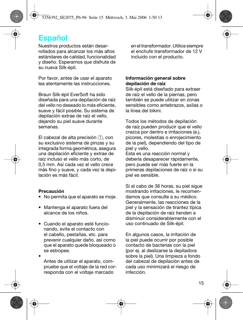 Cet appareil est conforme aux normes Européennes fixées par les Directives 89/336/EEC et la directive Basse Tension 73/23/ EEC. A la fin de vie de votre appareil, veuillez ne pas le jeter avec vos déchets ménagers. Remettez-le à votre Centre Service agréé Braun ou déposez-le dans des sites de récupération appropriés conformément aux réglementations locales ou nationales en vigueur. 5356392_SE2075_P6-96 Seite 15 Mittwoch, 3. Mai 2006 1:50 13 Español Nuestros productos están desarrollados para alcanzar los más altos estándares de calidad, funcionalidad y diseño. Esperamos que disfrute de su nueva Silk·épil. Por favor, antes de usar el aparato lea atentamente las instrucciones. Braun Silk·épil EverSoft ha sido diseñada para una depilación de raíz del vello no deseado lo más eficiente, suave y fácil posible. Su sistema de depilación extrae de raíz el vello, dejando su piel suave durante semanas. El cabezal de alta precisión 1 , con su exclusivo sistema de pinzas y su integrada forma geométrica, asegura una depilación eficiente y extrae de raíz incluso el vello más corto, de 0,5 mm. Así cada vez el vello crece más fino y suave, y cada vez la depilación es más fácil. Precaución