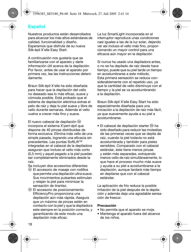 Español Nuestros productos están desarrollados para alcanzar los más altos estándares de calidad, funcionalidad y diseño. Esperamos que disfrute de su nueva Silk·épil X’elle Easy Start. A continuación nos gustaría que se familiarizarse con el aparato y darle información útil acerca de la depilación. Por favor, antes de usar el aparato por primera vez, lea las instrucciones detenidamente. Braun Silk·épil X’elle ha sido diseñada para hacer que la depilación del vello no deseado sea lo más eficaz, suave y cómoda posible. Está probado que el sistema de depilación eléctrica extrae el pelo de raíz y deja tu piel suave y libre de vello durante semanas. Además el vello vuelve a crecer más fino y suave. El nuevo cabezal de depilación B incorpora el sistema X’pert-épil que dispone de 40 pinzas distribuidas de forma exclusiva. Elimina más vello de una simple pasada, logrando una eficacia sin precedentes. Las puntas SoftLift™ integradas en el cabezal de la depiladora aseguran que incluso el vello más corto (0,5 mm) y aquel pegado a la piel puedan ser completamente eliminados desde la raíz. Se incluyen dos accesorios diferentes: A El accesorio de masaje con rodillos que permite una depilación ultra suave. Sus movimientos pulsantes estimulan y relajan la piel para minimizar la sensación de tirantez. a El accesorio de posicionamiento EfficiencyPro proporciona una depilación aún más rápida. Asegura que un máximo de pinzas estén en contacto con la piel y que la depiladora este siempre en la posición correcta, y garantizando de este modo una depilación más eficaz.