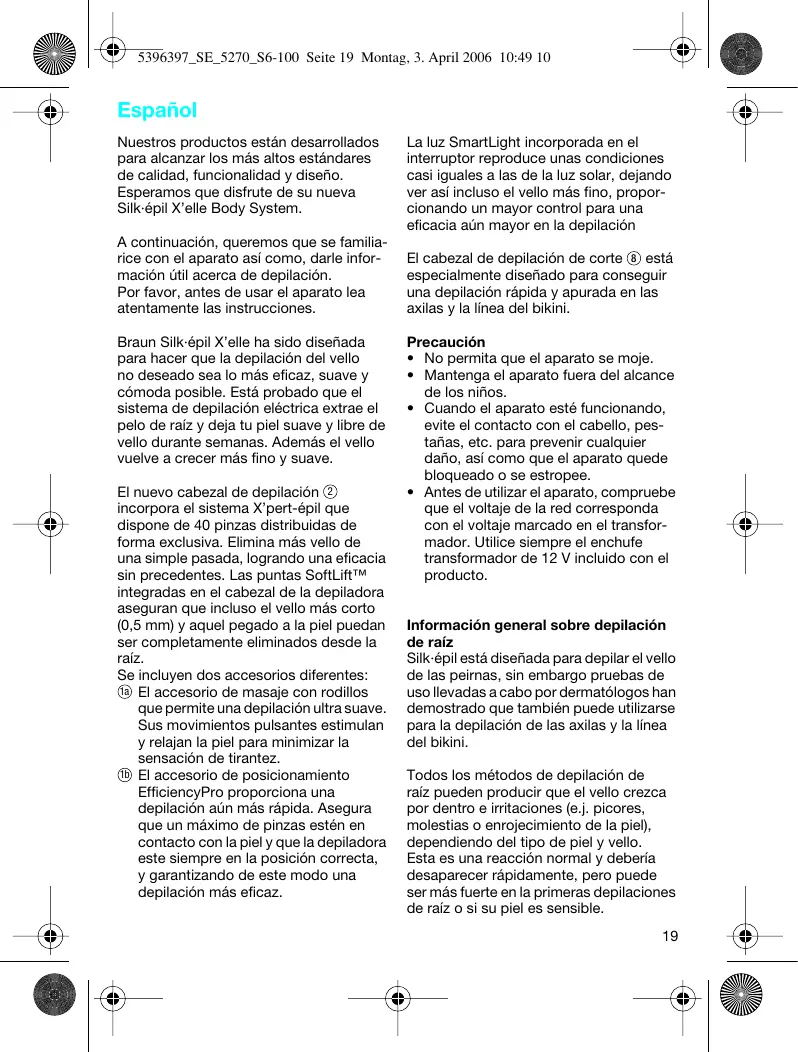 Español Nuestros productos están desarrollados para alcanzar los más altos estándares de calidad, funcionalidad y diseño. Esperamos que disfrute de su nueva Silk·épil X’elle Body System. A continuación, queremos que se familiarice con el aparato así como, darle información útil acerca de depilación. Por favor, antes de usar el aparato lea atentamente las instrucciones. Braun Silk·épil X’elle ha sido diseñada para hacer que la depilación del vello no deseado sea lo más eficaz, suave y cómoda posible. Está probado que el sistema de depilación eléctrica extrae el pelo de raíz y deja tu piel suave y libre de vello durante semanas. Además el vello vuelve a crecer más fino y suave. El nuevo cabezal de depilación 2 incorpora el sistema X’pert-épil que dispone de 40 pinzas distribuidas de forma exclusiva. Elimina más vello de una simple pasada, logrando una eficacia sin precedentes. Las puntas SoftLift™ integradas en el cabezal de la depiladora aseguran que incluso el vello más corto (0,5 mm) y aquel pegado a la piel puedan ser completamente eliminados desde la raíz. Se incluyen dos accesorios diferentes: 1a El accesorio de masaje con rodillos que permite una depilación ultra suave. Sus movimientos pulsantes estimulan y relajan la piel para minimizar la sensación de tirantez. 1b El accesorio de posicionamiento EfficiencyPro proporciona una depilación aún más rápida. Asegura que un máximo de pinzas estén en contacto con la piel y que la depiladora este siempre en la posición correcta, y garantizando de este modo una depilación más eficaz. La luz SmartLight incorporada en el interruptor reproduce unas condiciones casi iguales a las de la luz solar, dejando ver así incluso el vello más fino, proporcionando un mayor control para una eficacia aún mayor en la depilación El cabezal de depilación de corte 8 está especialmente diseñado para conseguir una depilación rápida y apurada en las axilas y la línea del bikini. Precaución