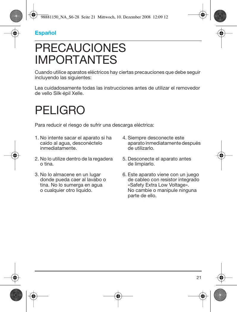 Español PRECAUCIONES IMPORTANTES Cuando utilice aparatos eléctricos hay ciertas precauciones que debe seguir incluyendo las siguientes: Lea cuidadosamente todas las instrucciones antes de utilizar el removedor de vello Silk-épil Xelle. PELIGRO Para reducir el riesgo de sufrir una descarga eléctrica: