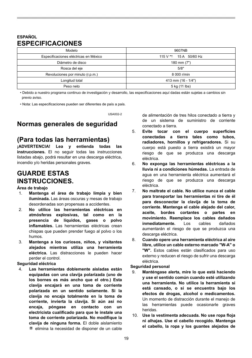 - Nota: Las especificaciones pueden ser diferentes de país a país. USA002-2 de alimentación de tres hilos conectado a tierra y de un sistema de suministro de corriente conectado a tierra. Evite tocar con el cuerpo superficies conectadas a tierra tales como tubos, radiadores, hornillos y refrigeradores. Si su cuerpo está puesto a tierra existirá un mayor riesgo de que se produzca una descarga eléctrica. No exponga las herramientas eléctricas a la lluvia ni a condiciones húmedas. La entrada de agua en una herramienta eléctrica aumentará el riesgo de que se produzca una descarga eléctrica. No maltrate el cable. No utilice nunca el cable para transportar las herramientas ni tire de él para desconectar la clavija de la toma de corriente. Mantenga el cable alejado del calor, aceite, bordes cortantes o partes en movimiento. Reemplace los cables dañados inmediatamente. Los cables dañados aumentarán el riesgo de que se produzca una descarga eléctrica. Cuando opere una herramienta eléctrica al aire libre, utilice un cable externo marcado "W-A" o "W". Estos cables están clasificados para uso externo y reducen el riesgo de sufrir una descarga eléctrica. Seguridad personal Manténgase alerta, mire lo que está haciendo y use el sentido común cuando esté utilizando una herramienta. No utilice la herramienta si está cansado, o si se encuentra bajo los efectos de drogas, alcohol o medicamentos. Un momento de distracción durante el manejo de las herramientas puede ocasionarle graves heridas.