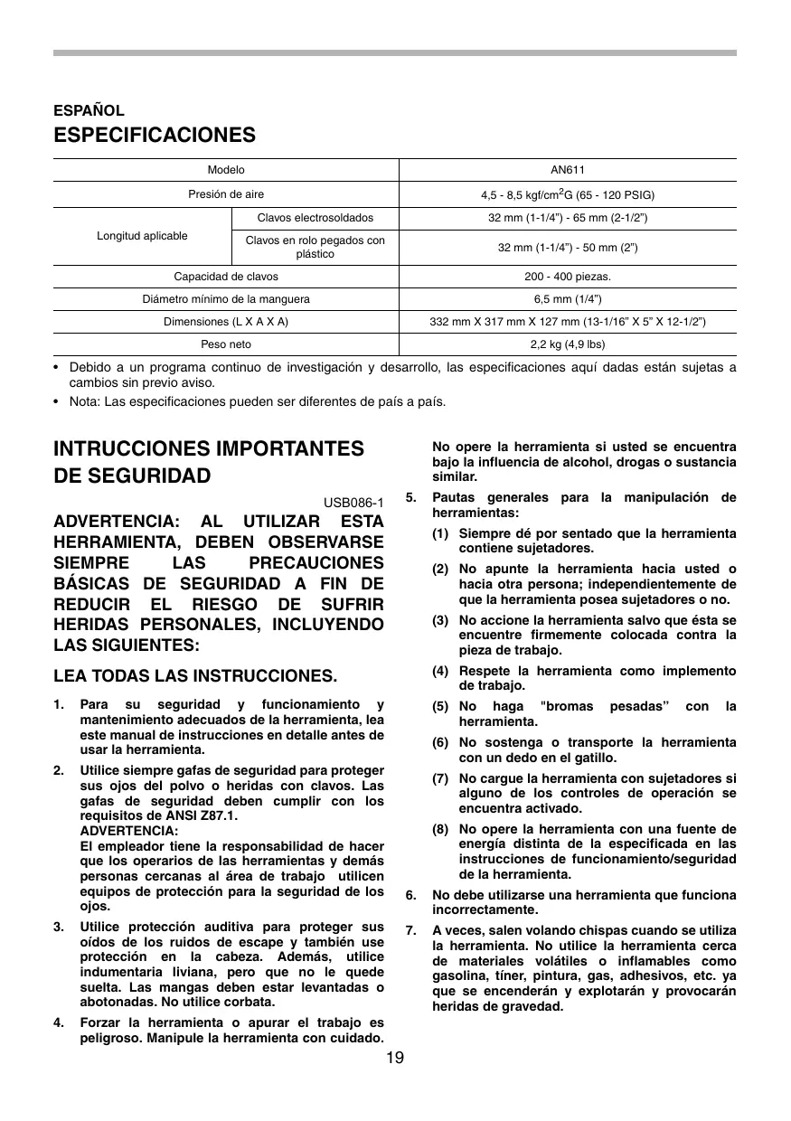- Utilice solamente los clavos espécificados en este manual. Si utilizes除外 clavos, la herramipta pueda hacer incorrectamente.