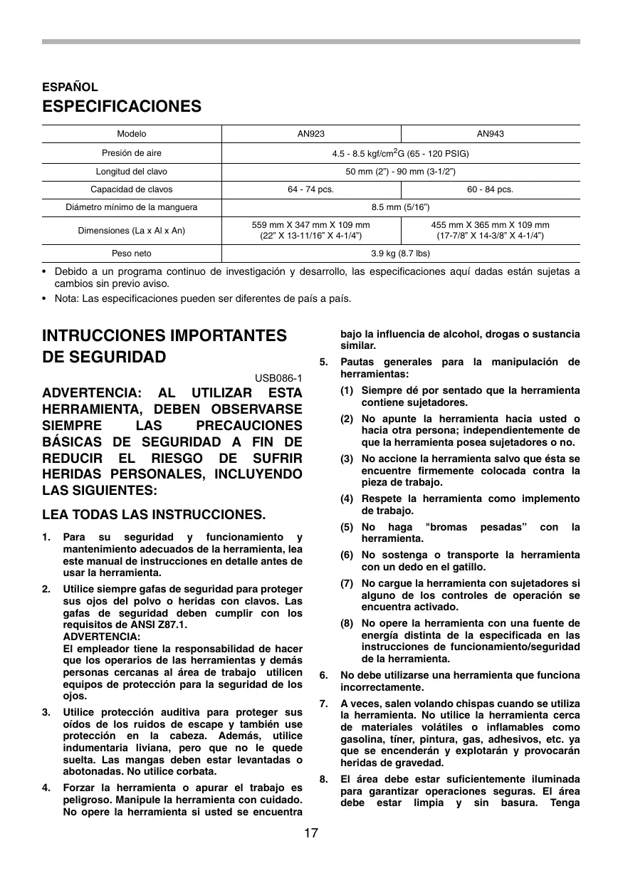 este manual. Si utiliza otros clavos, la herramienta puede funcionar incorrectamente. especialmente cuidado y conserve el equilibrio y una postura firme.