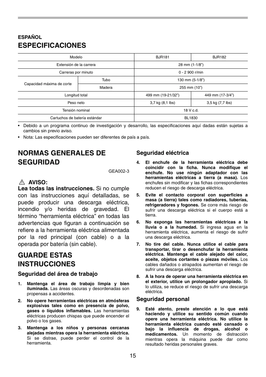 BJR182 - Sierra de sable inalámbrica MAKITA - Manual de uso y guía de instrucciones gratis