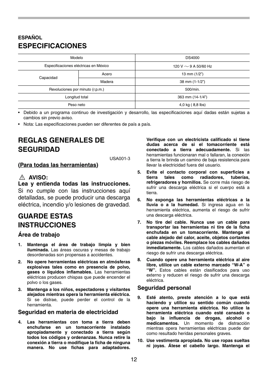 SEGURIDAD Verifique con un electricista calificado si tiene dudas acerca de si el tomacorriente está conectado a tierra adecuadamente. Si las herramientas funcionaran mal o fallaran, la conexión a tierra le brinda un camino de baja resistencia para llevar la electricidad fuera del usuario. USA001-3 (Para todas las herramientas) AVISO: Lea y entienda todas las instrucciones. Si no cumple con las instrucciones aquí detalladas, se puede producir una descarga eléctrica, incendio y/o lesiones de gravedad. GUARDE ESTAS INSTRUCCIONES