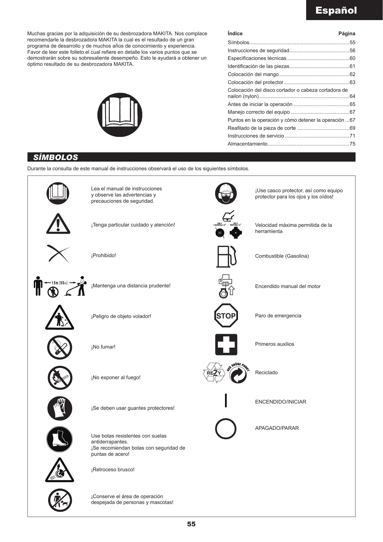 - Carburetor Primer Pump Español Muchas gracias por la adquisición de su desbrozadora MAKITA. Nos complace recomendarle la desbrozadora MAKITA la cual es el resultado de un gran programa de desarrollo y de muchos años de conocimiento y experiencia. Favor de leer este folleto el cual refiere en detalle los varios puntos que se demostrarán sobre su sobresaliente desempeño. Esto le ayudará a obtener un óptimo resultado de su desbrozadora MAKITA. Índice Página Símbolos p. 55