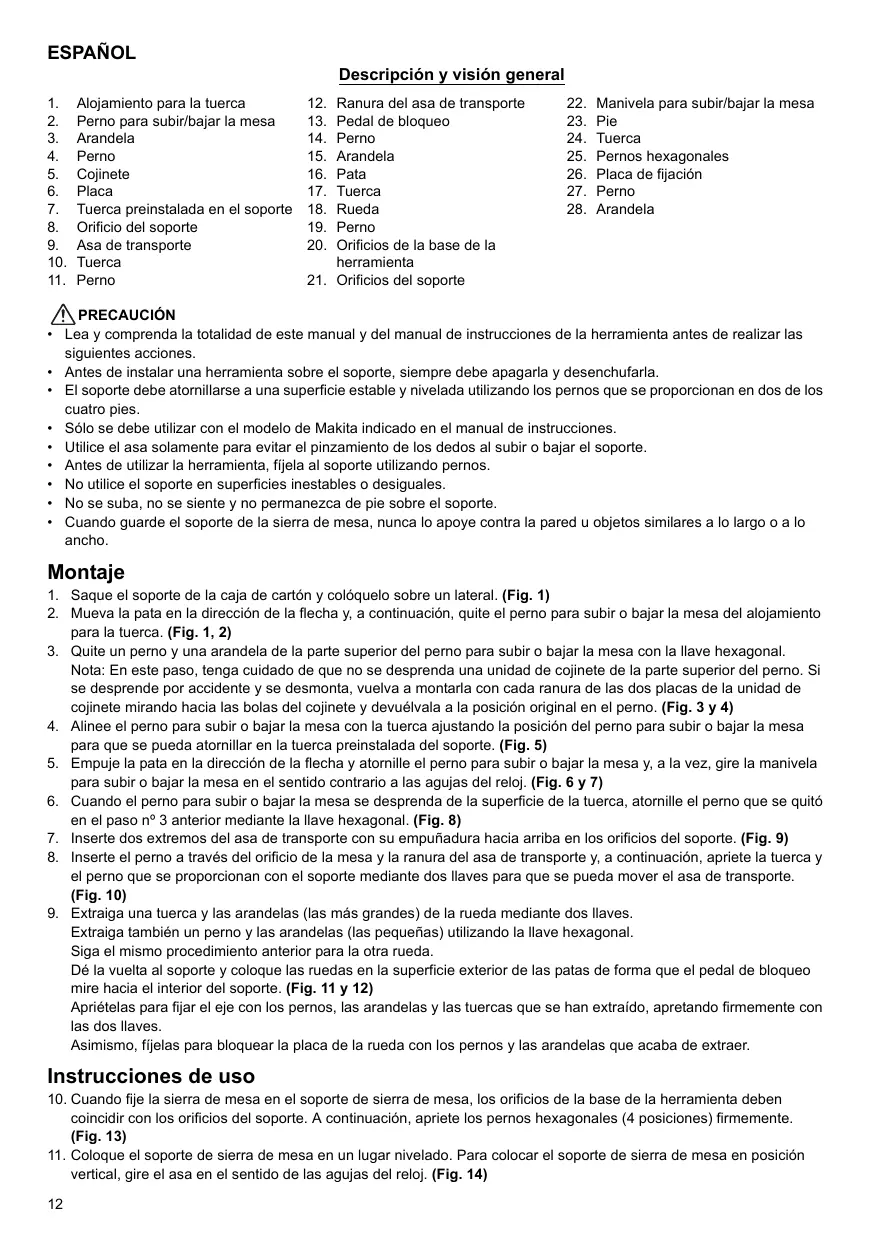 S ESPANOL Descripcién y visién general 1. Alojamiento para la tuerca 12. Ranura del asa de transporte 22. Manivela para subir/bajar la mesa 2. Perno para subir/bajar la mesa 13. Pedal de bloqueo 23. Pie 3. Arandela 14. Perno 24. Tuerca 4. Perno 15. Arandela 25. Pernos hexagonales 5. Cojnete 16. Pata 26. Placa de fijaciôn 6. Placa 17. Tuerca 27. Perno 7. Tuerca preinstalada en el soporte 18. Rueda 28. Arandela 8. Orificio del soporte 19. Perno 9. Asa de transporte 20. Orificios de la base de la 10. Tuerca herramienta 11. Perno 21. Orificios del soporte