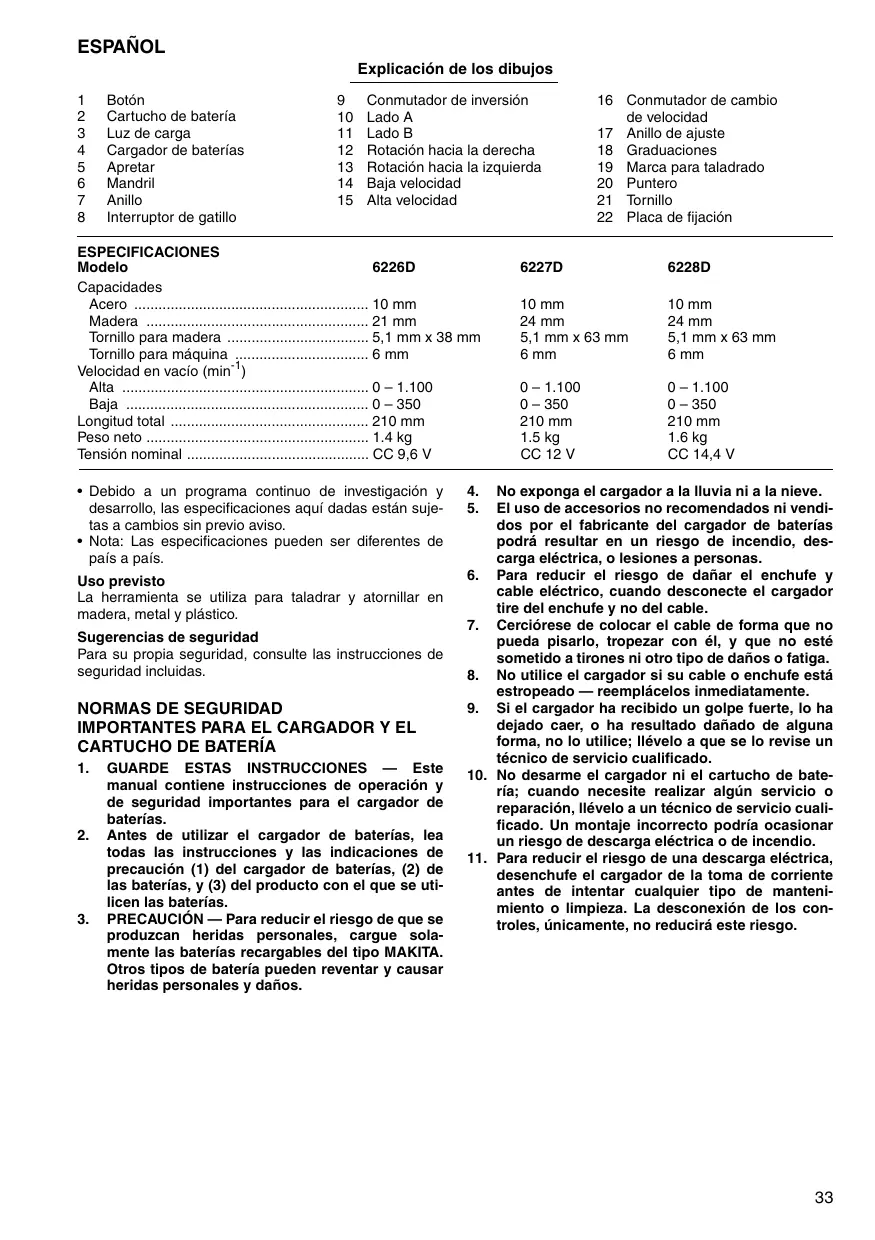 1 Botén 9 Conmutador de inversién 16. Conmutador de cambio 2 Cartucho de bateria 10 Lado À de velocidad 3 Luz de carga 11 LadoB 17 Anillo de ajuste 4 Cargador de baterias 12 Rotacién hacia la derecha 18 Graduaciones 5 Apretar 13. Rotacién hacia la izquierda 19 Marca para taladrado 6 Mandril 14 Baja velocidad 20 Puntero 7 Anillo 15 Alta velocidad 21 Tornillo 8 Interruptor de gatillo 22 Placa de fiaciôn ESPECIFICACIONES Modelo 6226D 6227D 6228D Capacidades Acero 10 mm 10 mm Madera 24 mm 24 mm Tomillo para madera 51mmx63mm 5,1mmx63mm Tomillo para méquina 6mm 6 mm Velocidad en vacio (min” er 0-1.100 0-1.100 0- 350 0- 350 Longitud total 210mm 210mm Peso neto 1.5kg 1.6kg Tensiôn nominal cc 12V cc144V