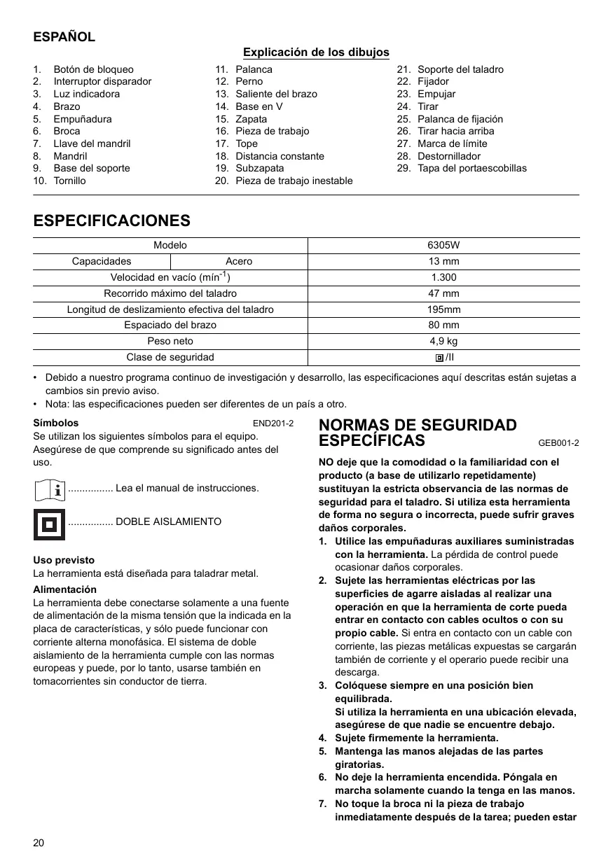 - Nota: las especificaciones pueden ser diferentes de un país a otro. END201-2 Símbolos Se utilizan los siguientes símbolos para el equipo. Asegúrese de que comprende su significado antes del uso. ................ Lea el manual de instrucciones. ................ DOBLE AISLAMIENTO Uso previsto La herramienta está diseñada para taladrar metal. Alimentación La herramienta debe conectarse solamente a una fuente de alimentación de la misma tensión que la indicada en la placa de características, y sólo puede funcionar con corriente alterna monofásica. El sistema de doble aislamiento de la herramienta cumple con las normas europeas y puede, por lo tanto, usarse también en tomacorrientes sin conductor de tierra.