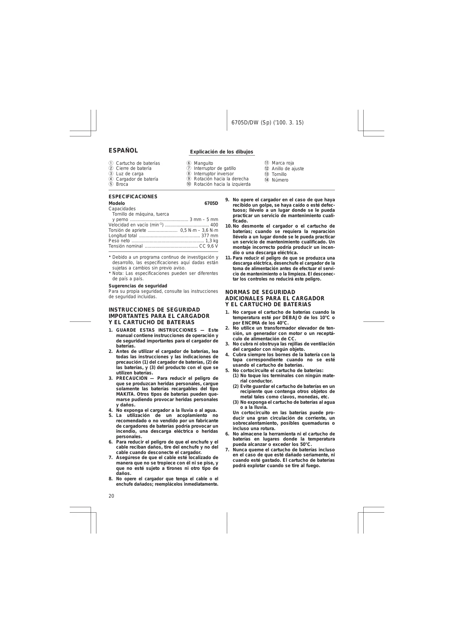 1. GUARDE ESTAS INSTRUCCIONES — Este manual contiene instrucciones de operación y de seguridad importantes para el cargador de baterías. 2. Antes de utilizar el cargador de baterías, lea todas las instrucciones y las indicaciones de precaución (1) del cargador de baterías, (2) de las baterías, y (3) del producto con el que se utilizen baterías. 3. PRECAUCIO u N — Para reducir el peligro de que se produzcan heridas personales, cargue solamente las baterías recargables del tipo MAKITA. Otros tipos de baterías pueden quemarse pudiendo provocar heridas personales y daños. 4. No exponga el cargador a la lluvia o al agua. 5. La utilización de un acoplamiento no recomendado o no vendido por un fabricante de cargadores de baterías podría provocar un incendio, una descarga eléctrica o heridas personales. 6. Para reducir el peligro de que el enchufe y el cable reciban daños, tire del enchufe y no del cable cuando desconecte el cargador. 7. Asegúrese de que el cable esté localizado de manera que no se tropiece con él ni se pise, y que no esté sujeto a tirones ni otro tipo de daños. 8. No opere el cargador que tenga el cable o el enchufe dañados; reemplácelos inmediatamente.