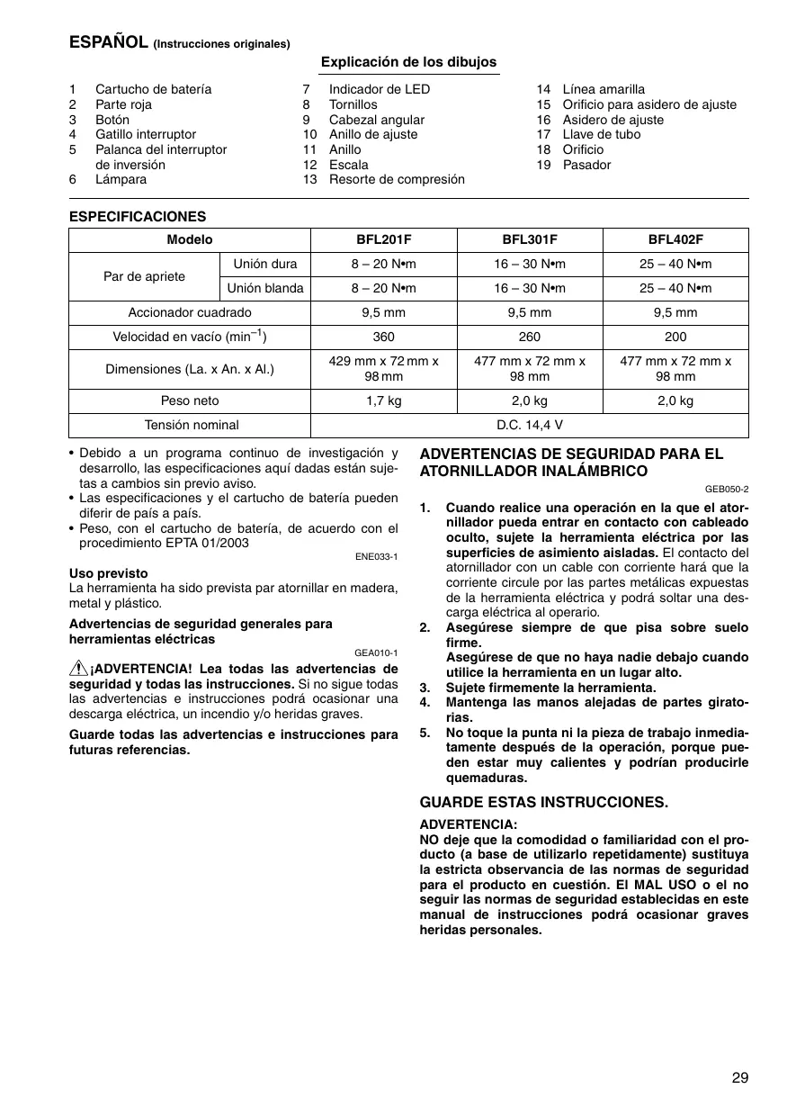 Batería y cargadore genuino de Makita Asidero de ajuste Protector Conjunto de cabezal angular (Para modelo BFL201F solamente) ENG905-1 Ruido El nivel de ruido A-ponderado típico determinado de acuerdo con la norma EN60745: Modelo BFL201F, BFL402F Nivel de presión sonora (LpA): 72 dB (A) Error (K): 3 dB (A) El nivel de ruido en condiciones de trabajo puede que sobrepase los 80 dB (A). Modelo BFL301F Nivel de presión sonora (LpA): 74 dB (A) Error (K): 3 dB (A) El nivel de ruido en condiciones de trabajo puede que sobrepase los 80 dB (A). Póngase protectores en los oídos ENG900-1 Vibración El valor total de la vibración (suma de vectores triaxiales) determinado de acuerdo con la norma EN60745: Modo tarea: atornillado sin impacto Emisión de vibración (ah): 2,5 m/s2 o menos Error (K): 1,5 m/s2 ENG901-1