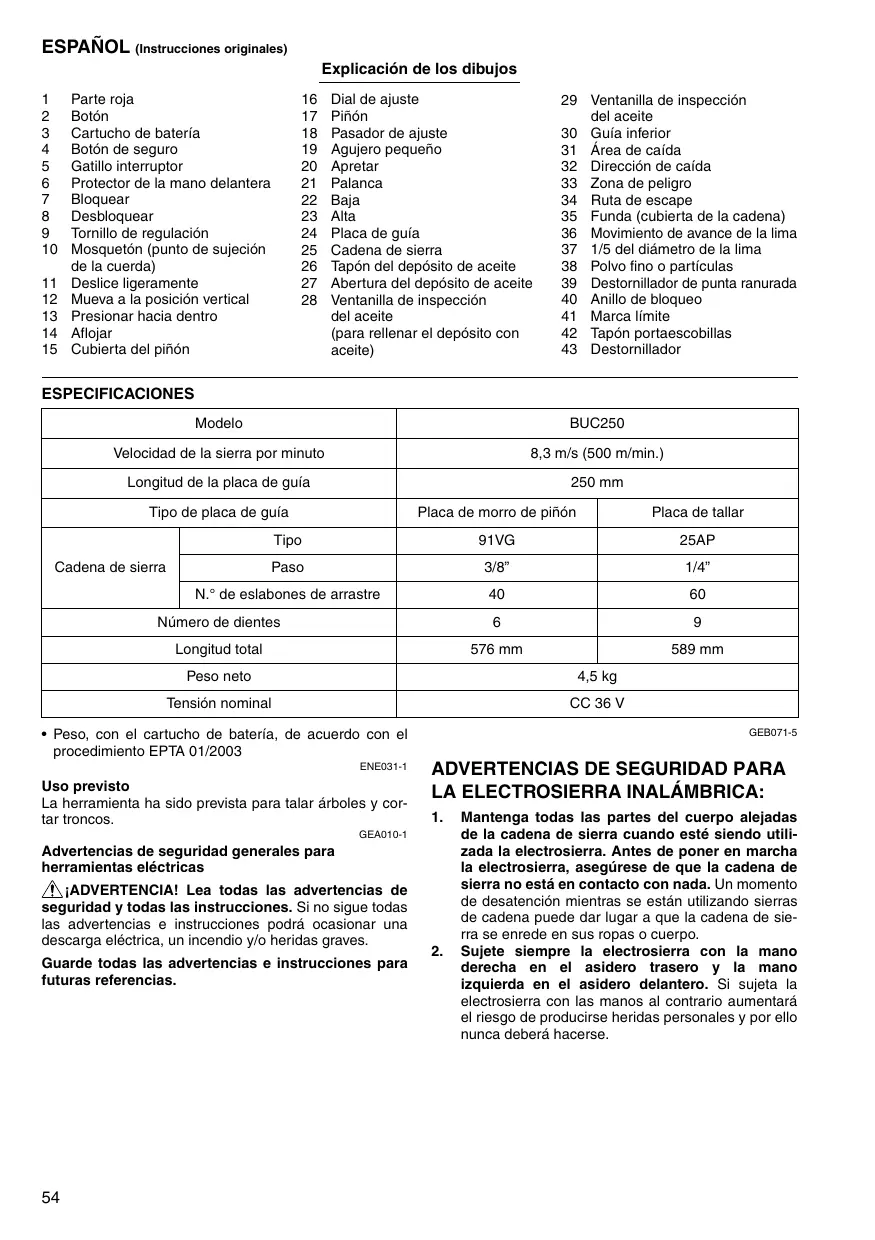 Dial de ajuste Piñón Pasador de ajuste Agujero pequeño Apretar Palanca Baja Alta Placa de guía Cadena de sierra Tapón del depósito de aceite Abertura del depósito de aceite Ventanilla de inspección del aceite (para rellenar el depósito con aceite) 29 Ventanilla de inspección del aceite 30 Guía inferior 31 Área de caída 32 Dirección de caída 33 Zona de peligro 34 Ruta de escape 35 Funda (cubierta de la cadena) 36 Movimiento de avance de la lima 37 1/5 del diámetro de la lima 38 Polvo fino o partículas 39 Destornillador de punta ranurada 40 Anillo de bloqueo 41 Marca límite 42 Tapón portaescobillas 43 Destornillador ESPECIFICACIONES Modelo BUC250 Velocidad de la sierra por minuto Longitud de la placa de guía 250 mm Tipo de placa de guía Placa de morro de piñón N.° de eslabones de arrastre