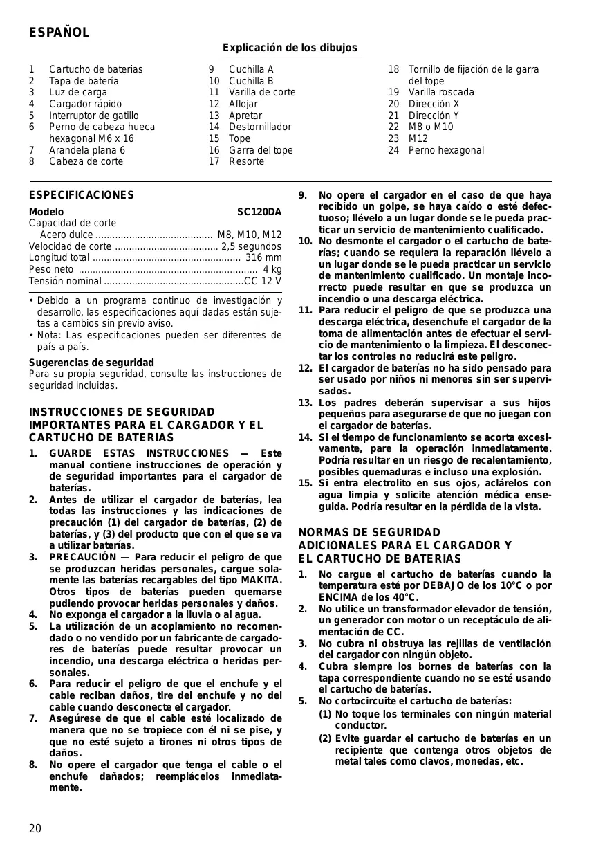 Cuchilla A Cuchilla B Varilla de corte Aflojar Apretar Destornillador Tope Garra del tope Resorte ESPECIFICACIONES Modelo SC120DA Capacidad de corte Acero dulce .......................................... M8, M10, M12 Velocidad de corte ..................................... 2,5 segundos Longitud total ..................................................... 316 mm Peso neto ................................................................ 4 kg Tensión nominal ..................................................CC 12 V