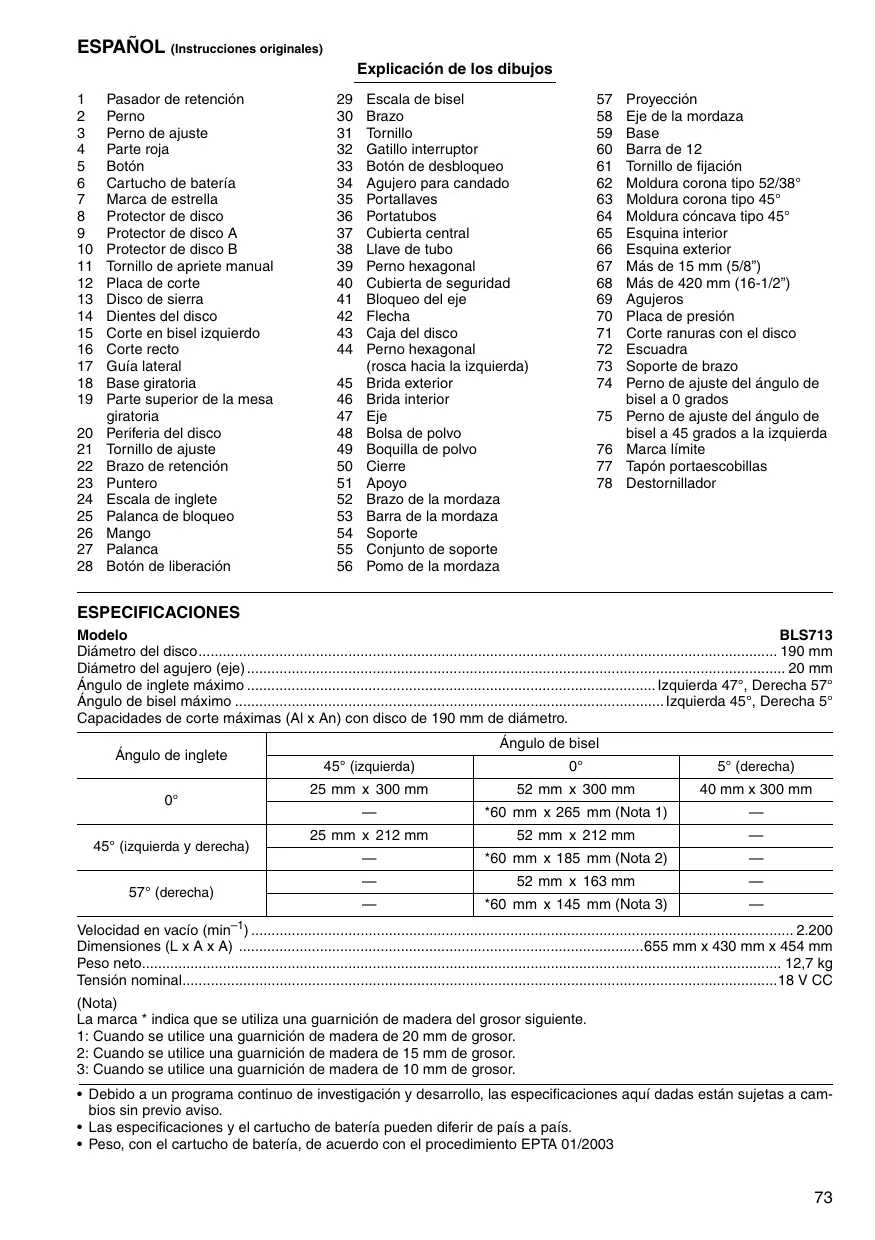 58 59 Tornillo de fijación Moldura corona tipo 52/38° Moldura corona tipo 45° Moldura cóncava tipo 45° 3: Cuando se utilice una guarnición de madera de 10 mm de grosor. • Debido a un programa continuo de investigación y desarrollo, las especificaciones aquí dadas están sujetas a cambios sin previo aviso. • Las especificaciones y el cartucho de batería pueden diferir de país a país. • Peso, con el cartucho de batería, de acuerdo con el procedimiento EPTA 01/2003