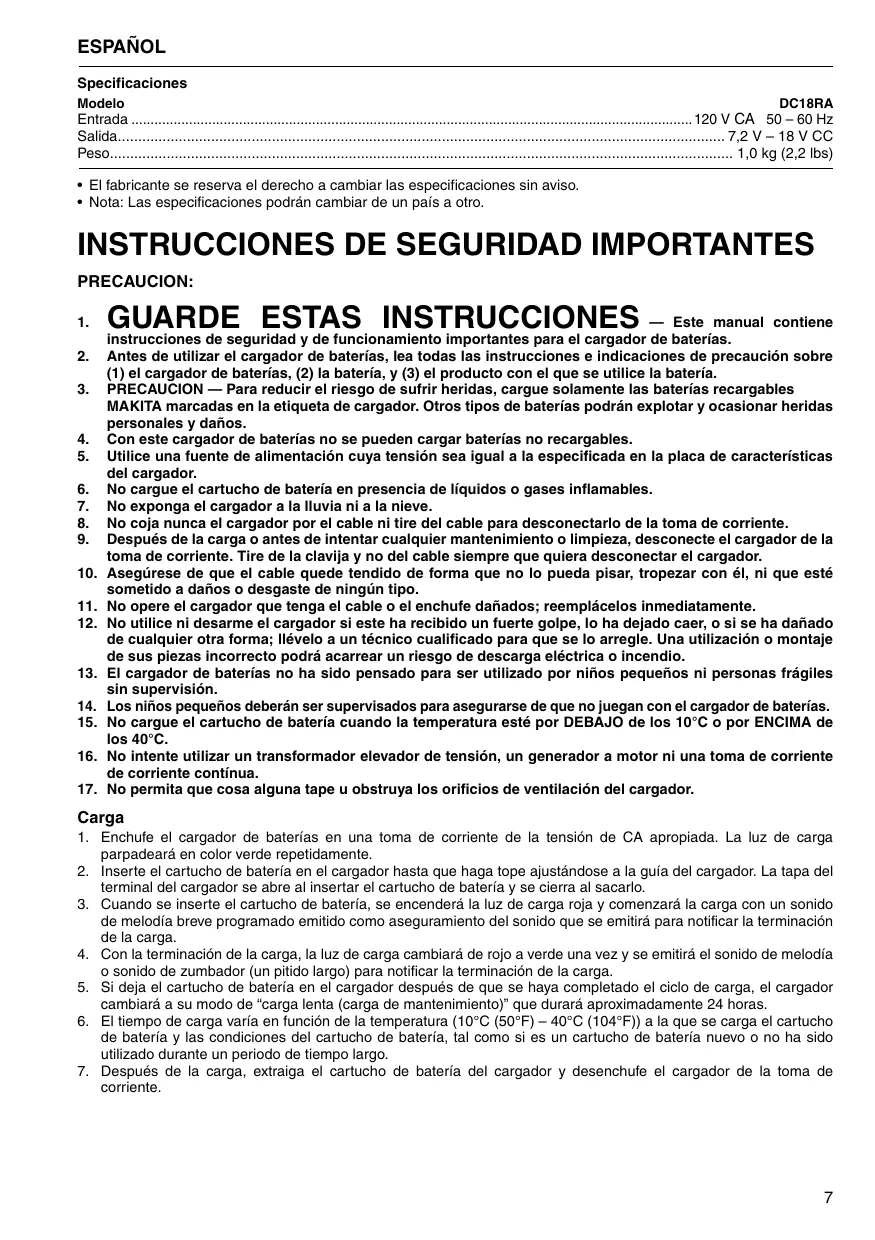 — Este manual contiene instrucciones de seguridad y de funcionamiento importantes para el cargador de baterías. Antes de utilizar el cargador de baterías, lea todas las instrucciones e indicaciones de precaución sobre (1) el cargador de baterías, (2) la batería, y (3) el producto con el que se utilice la batería. PRECAUCION — Para reducir el riesgo de sufrir heridas, cargue solamente las baterías recargables MAKITA marcadas en la etiqueta de cargador. Otros tipos de baterías podrán explotar y ocasionar heridas personales y daños. Con este cargador de baterías no se pueden cargar baterías no recargables. Utilice una fuente de alimentación cuya tensión sea igual a la especificada en la placa de características del cargador. No cargue el cartucho de batería en presencia de líquidos o gases inflamables. No exponga el cargador a la lluvia ni a la nieve. No coja nunca el cargador por el cable ni tire del cable para desconectarlo de la toma de corriente. Después de la carga o antes de intentar cualquier mantenimiento o limpieza, desconecte el cargador de la toma de corriente. Tire de la clavija y no del cable siempre que quiera desconectar el cargador. Asegúrese de que el cable quede tendido de forma que no lo pueda pisar, tropezar con él, ni que esté sometido a daños o desgaste de ningún tipo. No opere el cargador que tenga el cable o el enchufe dañados; reemplácelos inmediatamente. No utilice ni desarme el cargador si este ha recibido un fuerte golpe, lo ha dejado caer, o si se ha dañado de cualquier otra forma; llévelo a un técnico cualificado para que se lo arregle. Una utilización o montaje de sus piezas incorrecto podrá acarrear un riesgo de descarga eléctrica o incendio. El cargador de baterías no ha sido pensado para ser utilizado por niños pequeños ni personas frágiles sin supervisión. Los niños pequeños deberán ser supervisados para asegurarse de que no juegan con el cargador de baterías. No cargue el cartucho de batería cuando la temperatura esté por DEBAJO de los 10°C o por ENCIMA de los 40°C. No intente utilizar un transformador elevador de tensión, un generador a motor ni una toma de corriente de corriente contínua. No permita que cosa alguna tape u obstruya los orificios de ventilación del cargador. Carga