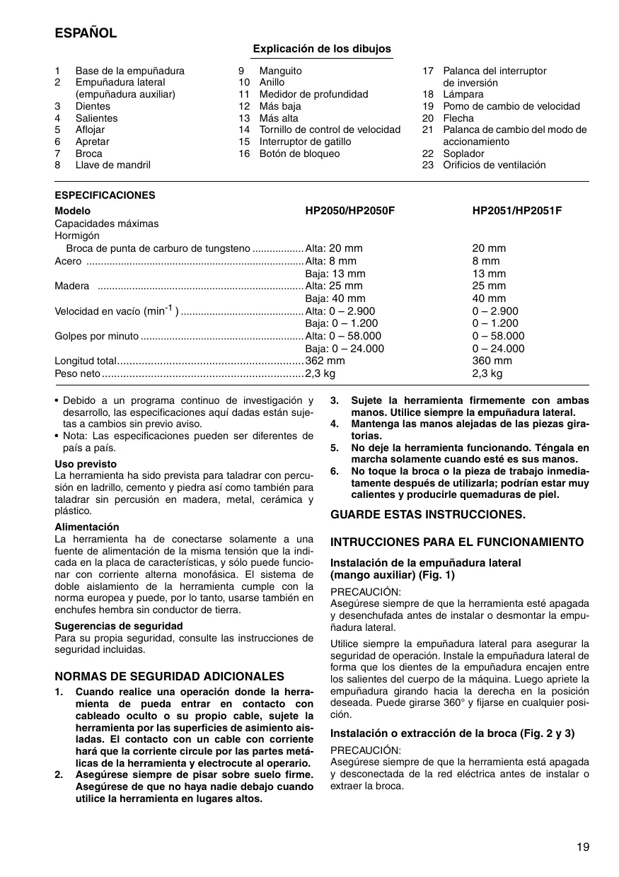 ESPANOL Explicacién de los dibujos 1 Base de la empuñadura 9 Manguito 17. Palanca del interruptor 2 Empuñadura lateral 10 Anillo de inversiôn (empuñadura auxiliar) 11. Medidor de profundidad 18 Lämpara 3 Dientes 12 Més baja 19. Pomo de cambio de velocidad 4 Salientes 13 Més alta 20 Flecha 5 Aflojar 14 Tornillo de control de velocidad 21 Palanca de cambio del modo de 6 Apretar 15 Interruptor de gatillo accionamiento 7 Broca 46. Botôn de bloqueo 22 Soplador 8 Liave de mandril 23 Orificios de ventilaciôn ESPECIFICACIONES Modelo HP2050/HP2050F HP2051/HP2051F Capacidades mäximas Hormigén Broca de punta de carburo de tungsteno Alta: 20 mm 20 mm enr . . Alta: 8 mm 8 mm 13 mm Alta: 25 mm 25 mm Baja: 40 mm 40 mm Velocidad en vacio (min! ) Alta: 0 — 2.900 02.900