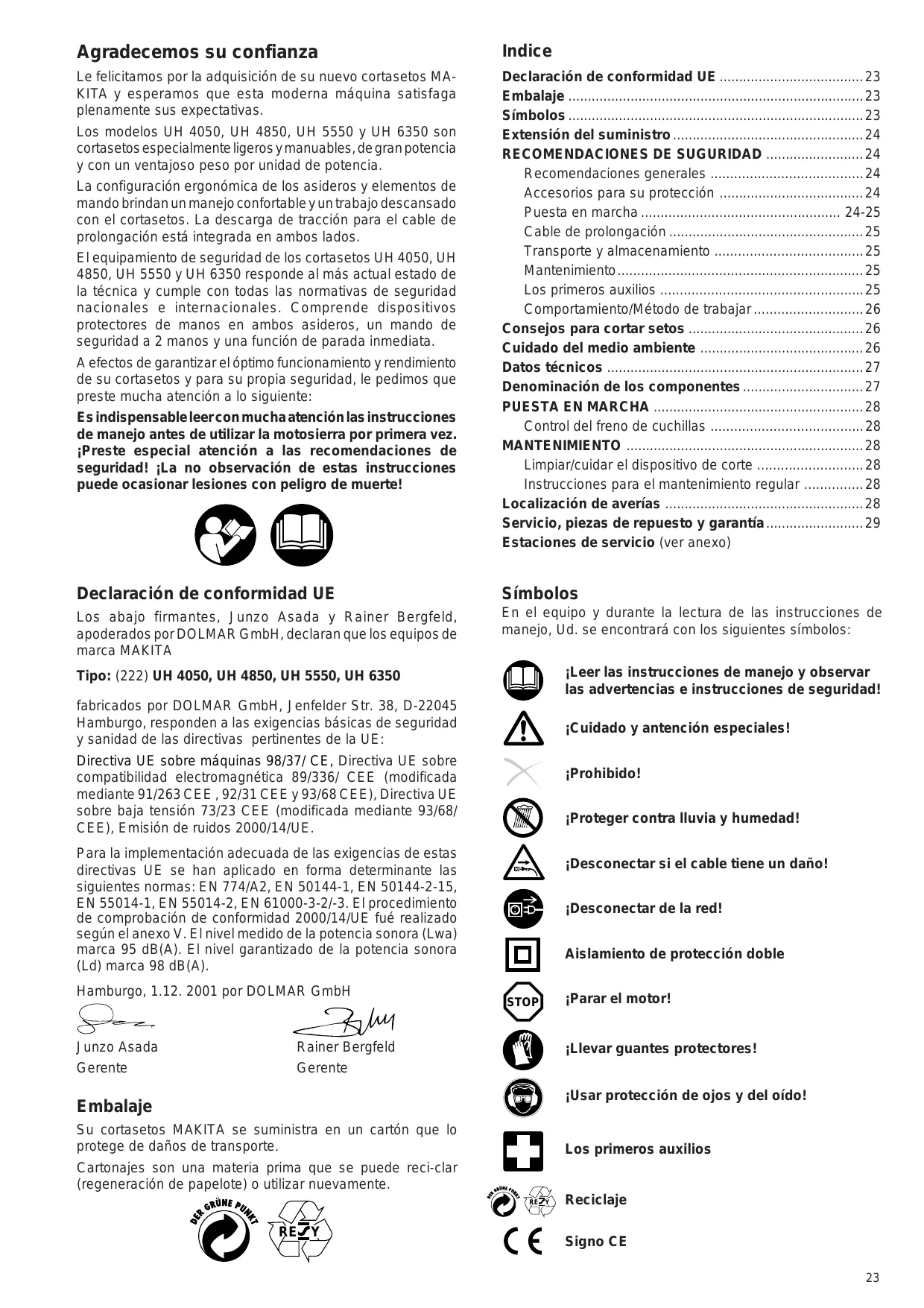 - Servicio, piezas de repuesto y garantía Estaciones de servicio (ver anexo) Los modelos UH 4050, UH 4850, UH 5550 y UH 6350 son cortasetos especialmente ligeros y manuables, de gran potencia y con un ventajoso peso por unidad de potencia. La configuración ergonómica de los asideros y elementos de mando brindan un manejo confortable y un trabajo descansado con el cortasetos. La descarga de tracción para el cable de prolongación está integrada en ambos lados. El equipamiento de seguridad de los cortasetos UH 4050, UH 4850, UH 5550 y UH 6350 responde al más actual estado de la técnica y cumple con todas las normativas de seguridad nacionales e internacionales. Comprende dispositivos protectores de manos en ambos asideros, un mando de seguridad a 2 manos y una función de parada inmediata. A efectos de garantizar el óptimo funcionamiento y rendimiento de su cortasetos y para su propia seguridad, le pedimos que preste mucha atención a lo siguiente: Es indispensable leer con mucha atención las instrucciones de manejo antes de utilizar la motosierra por primera vez. ¡Preste especial atención a las recomendaciones de seguridad! ¡La no observación de estas instrucciones puede ocasionar lesiones con peligro de muerte! Declaración de conformidad UE Símbolos Los abajo firmantes, Junzo Asada y Rainer Bergfeld, apoderados por DOLMAR GmbH, declaran que los equipos de marca MAKITA En el equipo y durante la lectura de las instrucciones de manejo, Ud. se encontrará con los siguientes símbolos: ¡Leer las instrucciones de manejo y observar las advertencias e instrucciones de seguridad! fabricados por DOLMAR GmbH, Jenfelder Str. 38, D-22045 Hamburgo, responden a las exigencias básicas de seguridad y sanidad de las directivas pertinentes de la UE: ¡Cuidado y antención especiales! Directiva UE sobre máquinas 98/37/ CE, Directiva UE sobre compatibilidad electromagnética 89/336/ CEE (modificada mediante 91/263 CEE , 92/31 CEE y 93/68 CEE), Directiva UE sobre baja tensión 73/23 CEE (modificada mediante 93/68/ CEE), Emisión de ruidos 2000/14/UE. ¡Prohibido! ¡Proteger contra lluvia y humedad! Para la implementación adecuada de las exigencias de estas directivas UE se han aplicado en forma determinante las siguientes normas: EN 774/A2, EN 50144-1, EN 50144-2-15, EN 55014-1, EN 55014-2, EN 61000-3-2/-3. El procedimiento de comprobación de conformidad 2000/14/UE fué realizado según el anexo V. El nivel medido de la potencia sonora (Lwa) marca 95 dB(A). El nivel garantizado de la potencia sonora (Ld) marca 98 dB(A). Hamburgo, 1.12. 2001 por DOLMAR GmbH Junzo Asada Rainer Bergfeld Gerente Gerente ¡Desconectar si el cable tiene un daño! ¡Desconectar de la red! Aislamiento de protección doble STOP ¡Parar el motor! ¡Llevar guantes protectores! ¡Usar protección de ojos y del oído! Embalaje Su cortasetos MAKITA se suministra en un cartón que lo protege de daños de transporte. Los primeros auxilios Cartonajes son una materia prima que se puede reci-clar (regeneración de papelote) o utilizar nuevamente. RE Y RE Y Reciclaje Signo CE p. 29