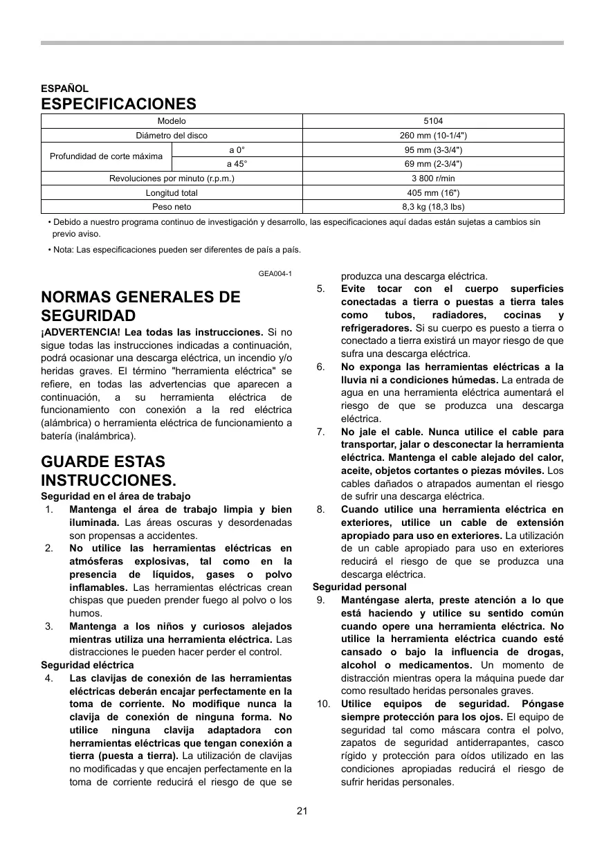ESPANOL ESPECIFICACIONES Modelo 5104 Diämelro del disco 260 mm (10-174) Profundidad de corte méxima 20 25 mm Se ea 69 mm (2-34) Revoluciones por minuto (rpm) 3 800 vin Longitud total 405 mm (16°) Peso neto 8,3kg (18,3 1bs) + Debido a nuestro programa continuo de investigacién y desarroll, las especiicaciones aqui dadas estän sujetas a cambios sin previo aviso. + Nota: Las especificaciones pueden ser diferentes de pais a pais. GEA0&1