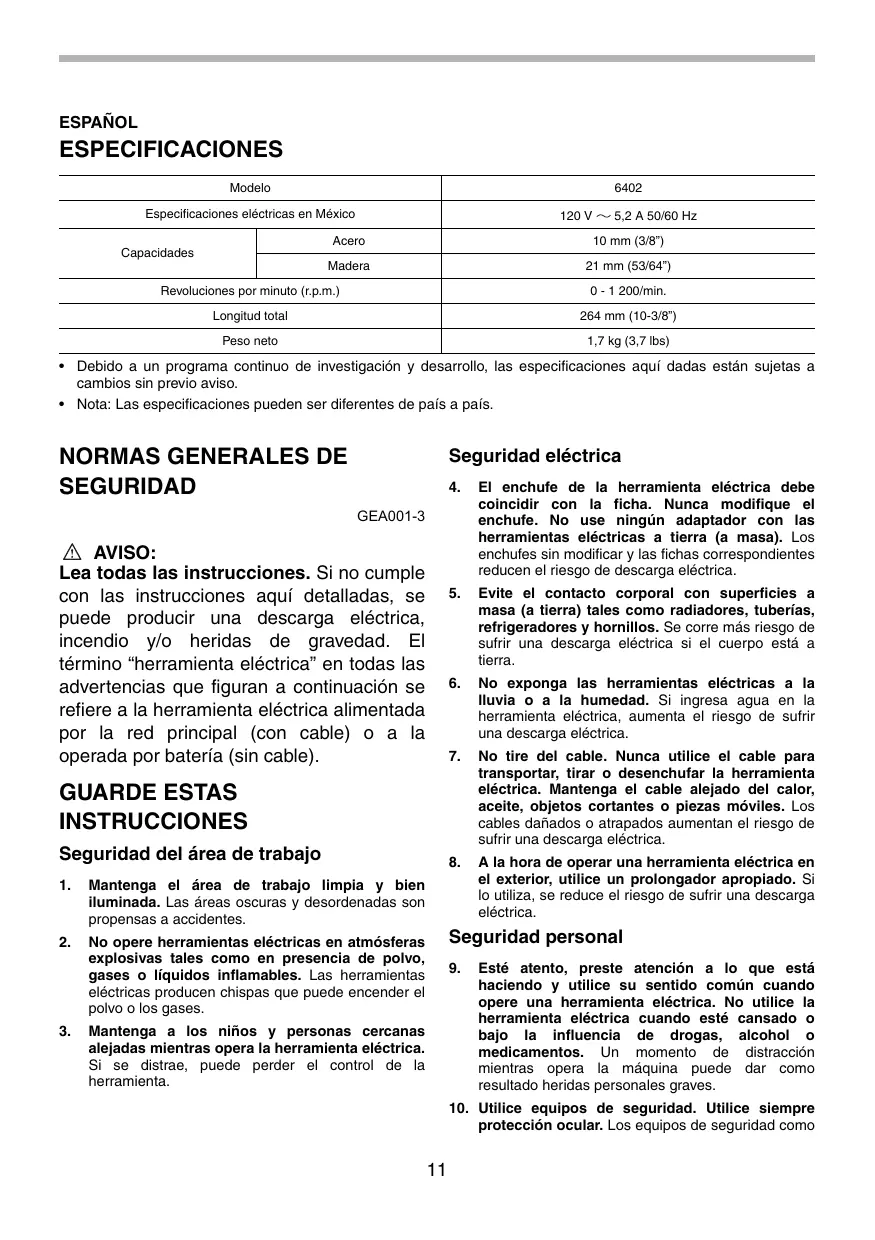 Especiicaciones eléctricas en México 120 V 5,2 À 50/60 Hz Acero 10 mm (3/8) Capacidades Madera 21 mm (53/64) Revoluciones por minuto (:.p.m.) 0-1 200/min. Longitud total 264 mm (10-3/8°) Peso neto 17 kg (87 be) + Debido a un programa continuo de investigaciôn y desarrollo, las especificaciones aqui dadas estän sujetas a cambios sin previo aviso. + Nota: Las especificaciones pueden ser diferentes de pais a pais