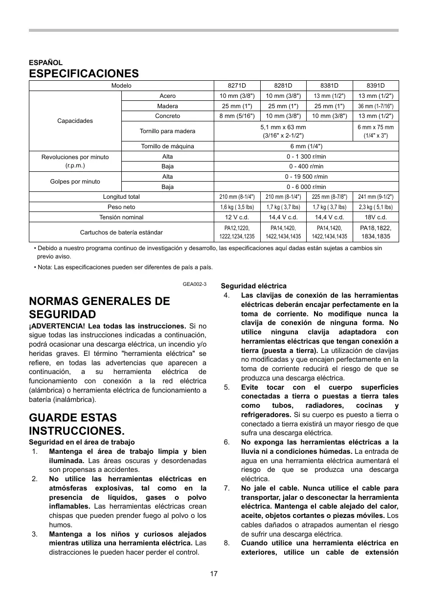 NORMAS ESPECÍFICAS DE SEGURIDAD NO deje que la comodidad o familiaridad con el producto (a base de utilizarlo repetidamente) sustituya la estricta observancia de las normas de seguridad para el taladro de percusión. Si utiliza esta herramienta eléctrica de forma no segura o incorrecta, podrá sufrir graves heridas personales.