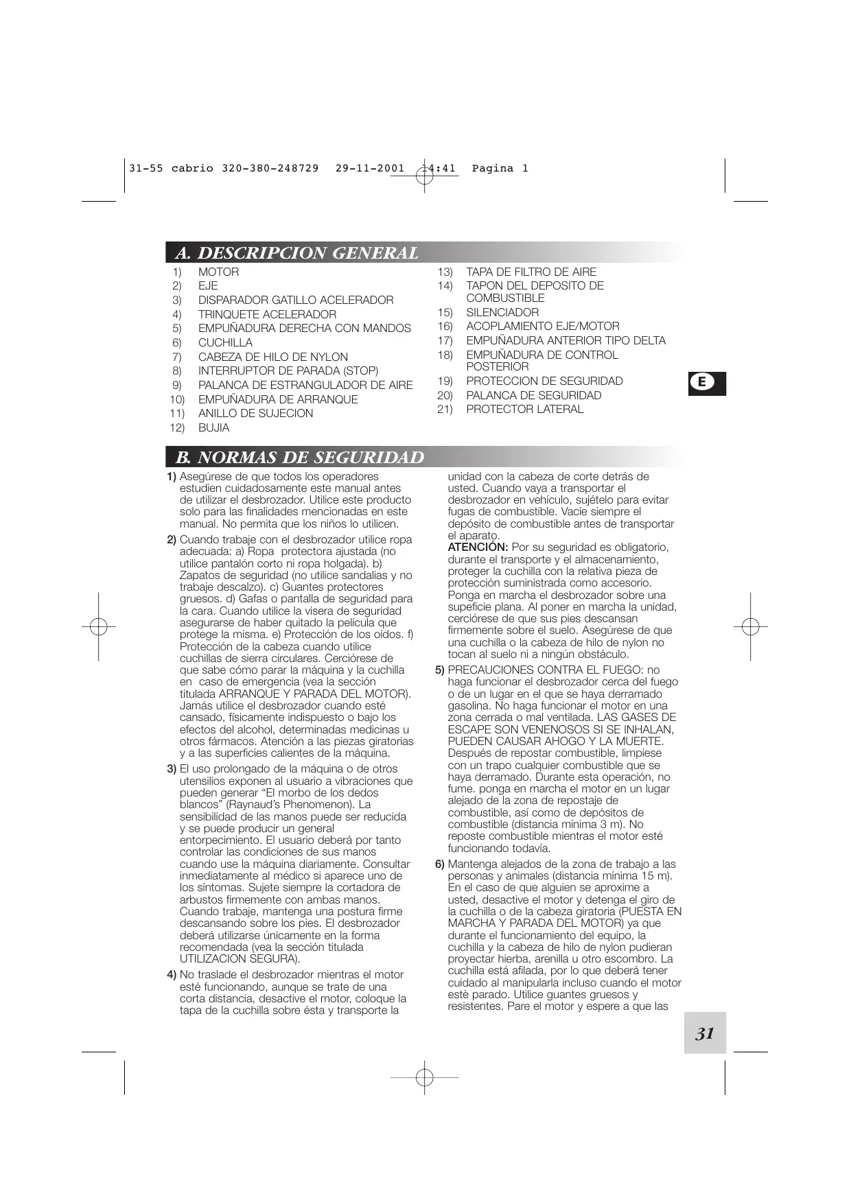 COLOGADA (vea las secciones UTILIZACION SEGURA y MONTAJE DE LAS CUCHILLAS Y DE LA CABEZA DE HILO DE NYLON). Preste cuidadosa atenciôn a las recomendaciones de seguridad, ya que de lo contrario podria poner en peligro su vida o la de otras personas como consecuencia de: a) posible contacto con las piezas de corte giratorias, b) posibilidad de que se proyecten o salgan despedidos diversos cuerpos solidos. ATENCION: no ponga en marcha el motor si no estä conectado al eje, Va que el embrague podria saltar en pedazos. En las mäquinas provistas de embrague, asegürese de que la herramienta de corte esté parada cuando el motor funciona a ralenti C. UTILIZACION SEGURA: Se recomienda usar la mäquina por la parte derecha del cuerpo; se darä asi la posibiidad de que el escape expulse los gases por la parte contraria del cuerpo.Si usa el desbrozador por primera vez es conveniente un primer periodo de adiestramiento. Compruebe cuidadosamente la méquina antes de utlizarla para asegurarse de que no existe ningün tornillo flojo, piezas dañadas fugas de combustible. Sustituya los accesorios dañados o excesivamente gastados (cuchillas, cabezas de hilo, piezas de protecciôn). Asegürese de que todos los trabajos de mantenimiento o de reparaciôn se lleven a cabo en un centro de servicio autorizado. NOTA. Con el fin de mantener el rendimiento y la seguridad, cerciérese de utiizar accesorios y piezas de repuesto originales. Evitar un uso excesivamente prolongado del desbrozador. Las vibraciones pueden causar algun daño.