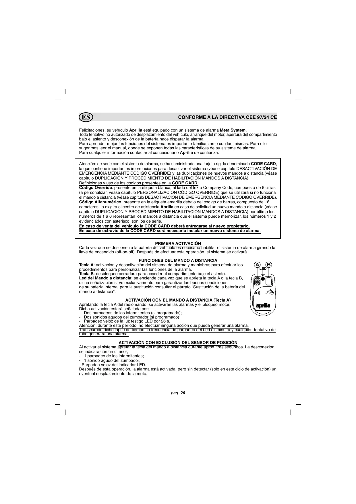 ES CONFORME A LA DIRECTIVA CEE 97/24 CE Felicitaciones, su vehículo Aprilia está equipado con un sistema de alarma Meta System. Todo tentativo no autorizado de desplazamiento del vehículo, arranque del motor, apertura del compartimiento bajo el asiento y desconexión de la batería hace disparar la alarma. Para aprender mejor las funciones del sistema es importante familiarizarse con las mismas. Para ello sugerimos leer el manual, donde se exponen todas las características de su sistema de alarma. Para cualquier información contactar al concesionario Aprilia de confianza. Atención: de serie con el sistema de alarma, se ha suministrado una tarjeta rígida denominada CODE CARD, la que contiene importantes informaciones para desactivar el sistema (véase capítulo DESACTIVACIÓN DE EMERGENCIA MEDIANTE CÓDIGO OVERRIDE) y las duplicaciones de nuevos mandos a distancia (véase capítulo DUPLICACIÓN Y PROCEDIMIENTO DE HABILITACIÓN MANDOS A DISTANCIA). Definiciones y uso de los códigos presentes en la CODE CARD: Código Override: presente en la etiqueta blanca, al lado del texto Company Code, compuesto de 5 cifras (a personalizar, véase capítulo PERSONALIZACIÓN CÓDIGO OVERRIDE) que se utilizará si no funciona el mando a distancia (véase capítulo DESACTIVACIÓN DE EMERGENCIA MEDIANTE CÓDIGO OVERRIDE). Código Alfanumérico: presente en la etiqueta amarilla debajo del código de barras, compuesto de 16 caracteres, lo exigirá el centro de asistencia Aprilia en caso de solicitud un nuevo mando a distancia (véase capítulo DUPLICACIÓN Y PROCEDIMIENTO DE HABILITACIÓN MANDOS A DISTANCIA) por último los números de 1 a 6 representan los mandos a distancia que el sistema puede memorizar, los números 1 y 2 evidenciados con asterisco, son los de serie. En caso de venta del vehículo la CODE CARD deberá entregarse al nuevo propietario. En caso de extravío de la CODE CARD será necesario instalar un nuevo sistema de alarma. PRIMERA ACTIVACIÓN Cada vez que se desconecta la batería del vehículo es necesario habilitar el sistema de alarma girando la llave de encendido (off-on-off). Después de efectuar esta operación, el sistema se activará. FUNCIONES DEL MANDO A DISTANCIA Tecla A: activación y desactivación del sistema de alarma y maniobras para efectuar los procedimientos para personalizar las funciones de la alarma. Tecla B: desbloqueo cerradura para acceder al compartimiento bajo el asiento. Led del Mando a distancia: se enciende cada vez que se aprieta la tecla A o la tecla B, dicha señalización sirve exclusivamente para garantizar las buenas condiciones de su batería interna, para la sustitución consultar el párrafo “Sustitución de la batería del mando a distancia”. ACTIVACIÓN CON EL MANDO A DISTANCIA (Tecla A) Apretando la tecla A del radiomando, se activarán las alarmas y el bloqueo motor. Dicha activación estará señalada por: - Dos parpadeos de los intermitentes (si programado); - Dos sonidos agudos del zumbador (si programado); - Parpadeo veloz de la luz testigo LED por 26 s. Atención: durante este período, no efectuar ninguna acción que pueda generar una alarma. Transcurrido dicho lapso de tiempo, la frecuencia de parpadeo del Led disminuirá y cualquier tentativo de robo generará una alarma. ACTIVACIÓN CON EXCLUSIÓN DEL SENSOR DE POSICIÓN Al activar el sistema apretar la tecla del mando a distancia durante aprox. tres segundos. La desconexión se indicará con un ulterior; - 1 parpadeo de los intermitentes; - 1 sonido agudo del zumbador; - Parpadeo veloz del indicador LED. Después de esta operación, la alarma está activada, pero sin detectar (solo en este ciclo de activación) un eventual desplazamiento de la moto.