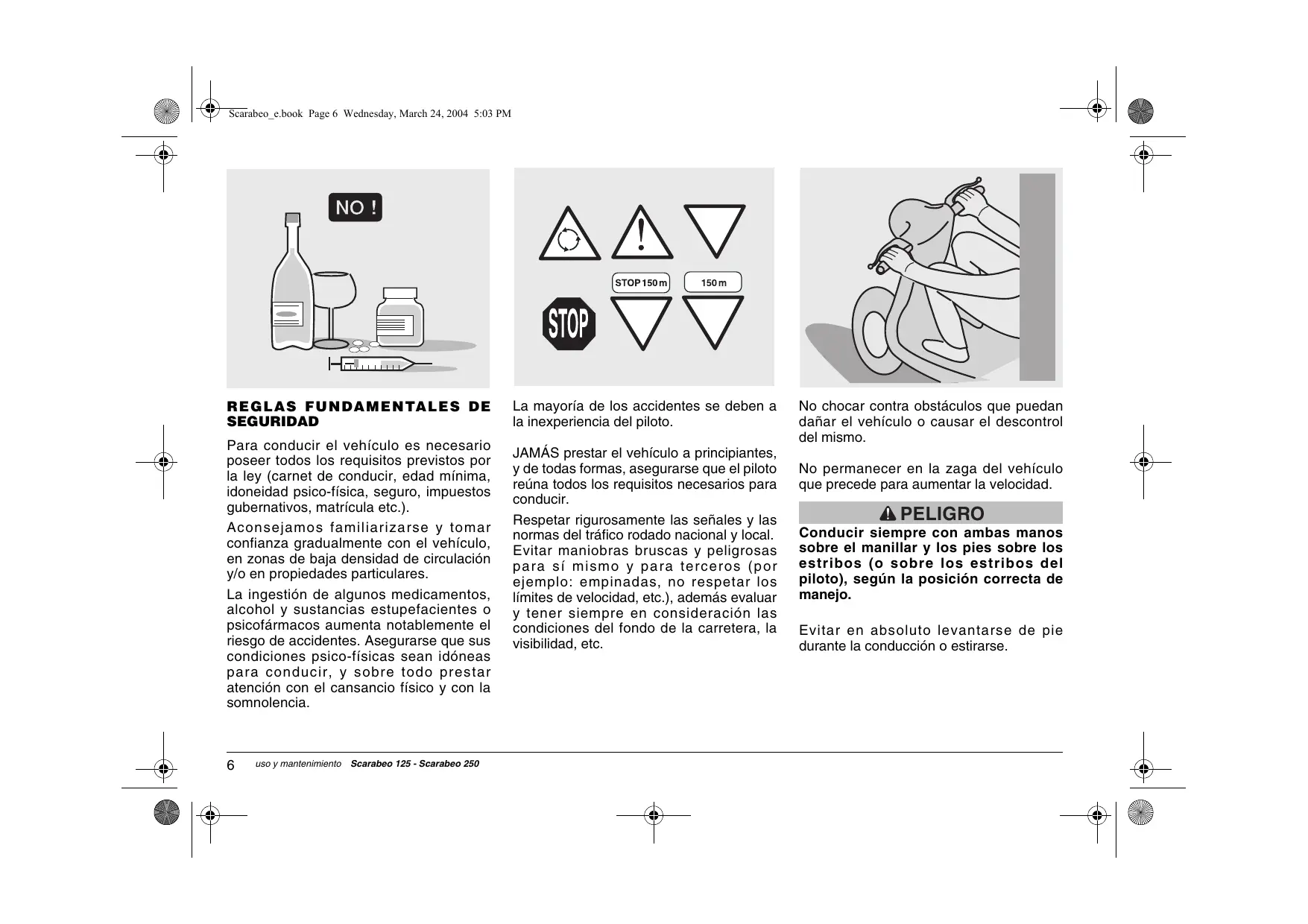 abeo_e.book Page 7 Wednesday, March 24, 2004 5:03 PM El piloto nunca tiene que distraerse, dejarse distraer o afectar por personas, objetos, acciones (no tiene que fumar, comer, beber, leer, etc.) durante la conduccién del vehiculo.