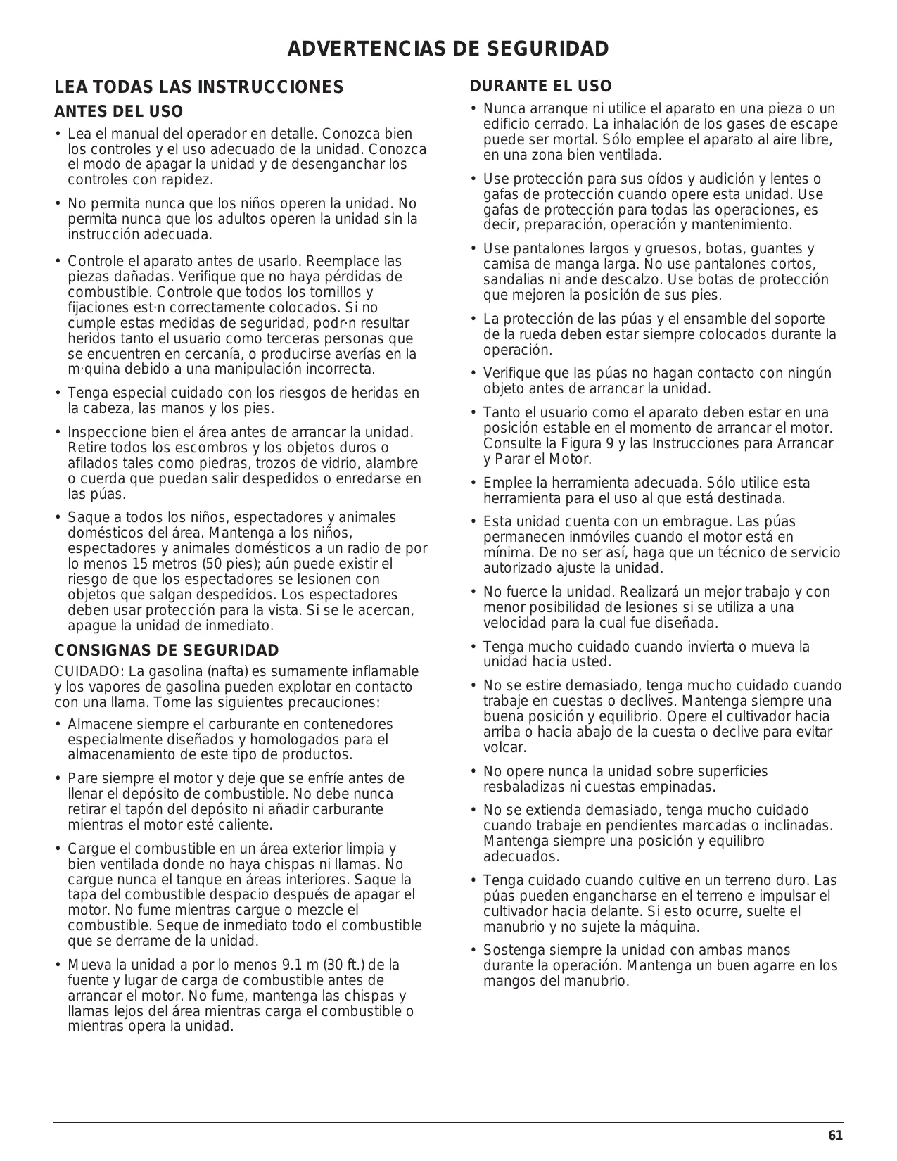 - Inspeccione bien el área antes de arrancar la unidad. Retire todos los escombros y los objetos duros o afilados tales como piedras, trozos de vidrio, alambre o cuerda que puedan salir despedidos o enredarse en las púas.